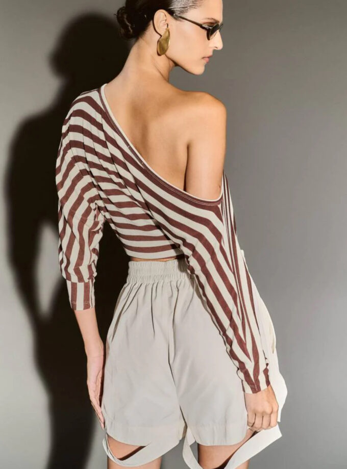 Bermuda estampada com listras acompanhada por um lenço