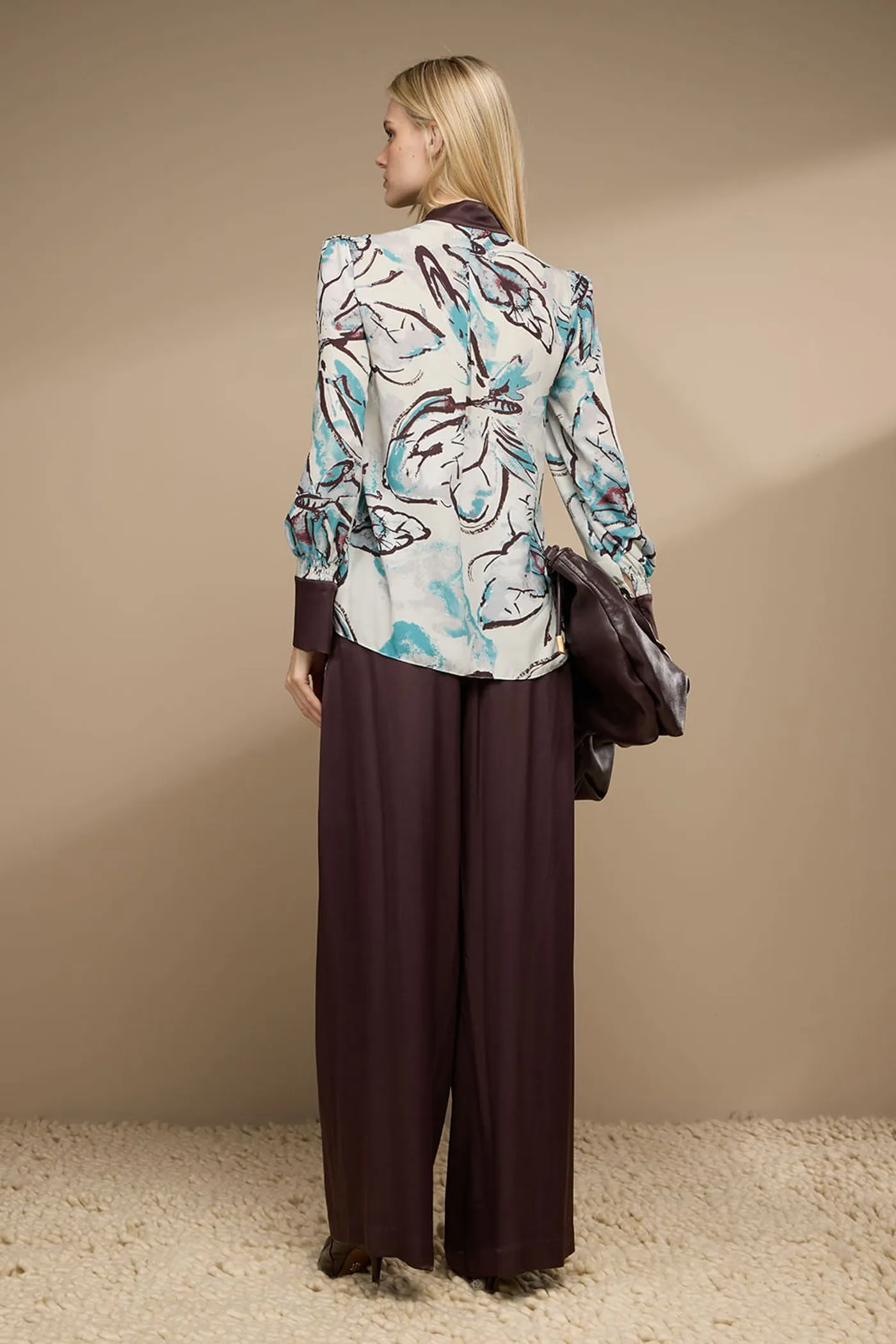 Blusa em chiffon com estampa borboleta e contraste em barolo, trazendo leveza, sofisticação