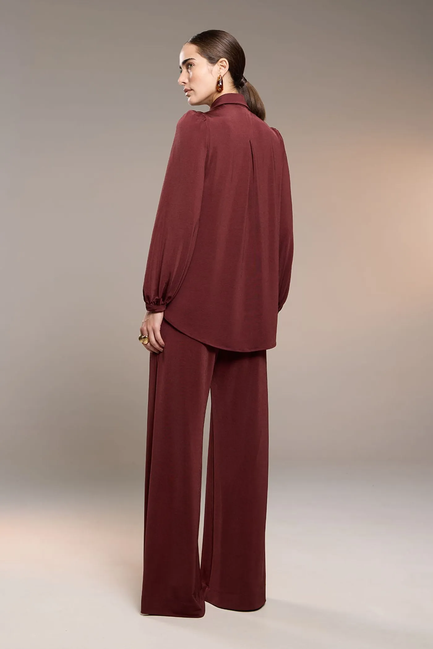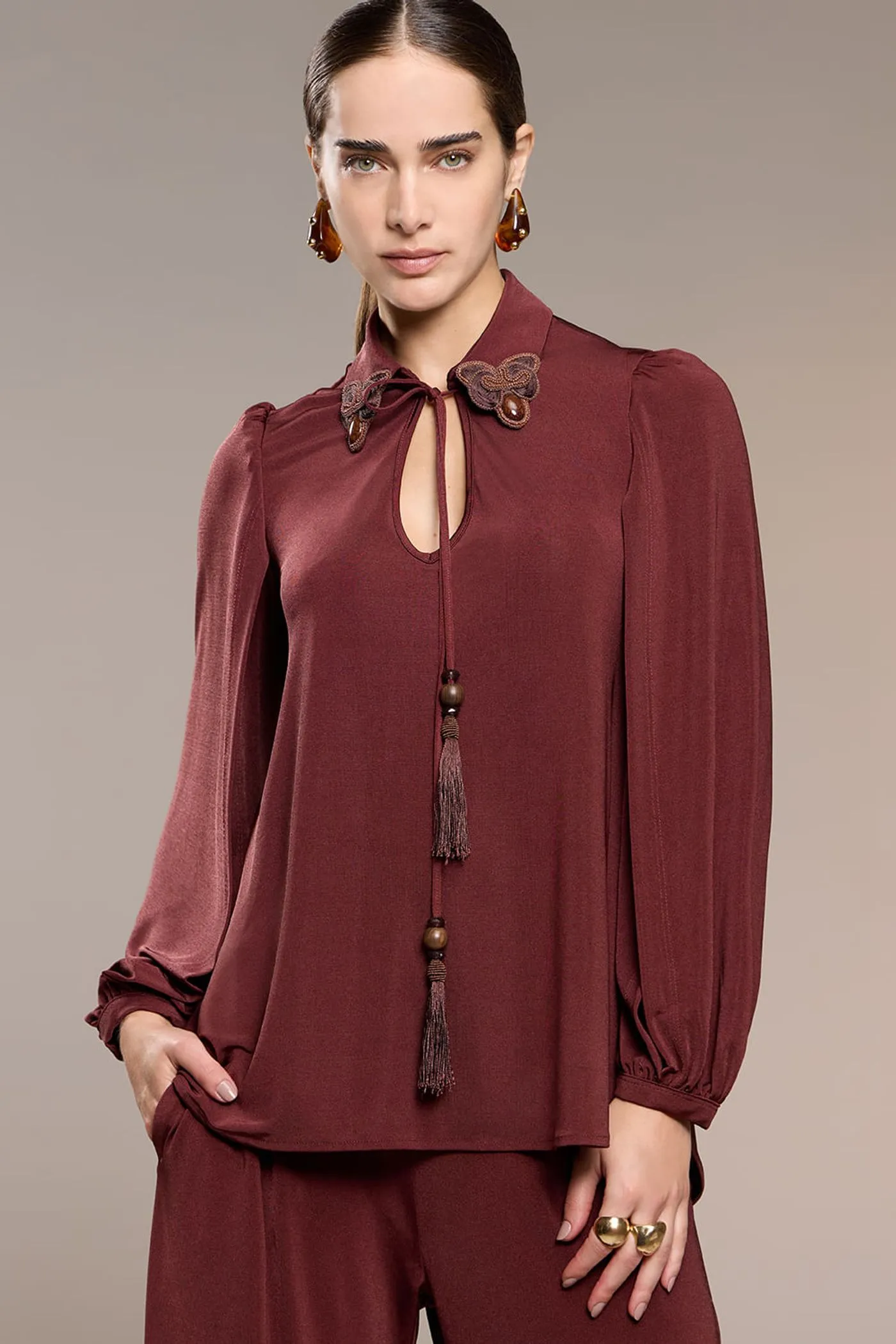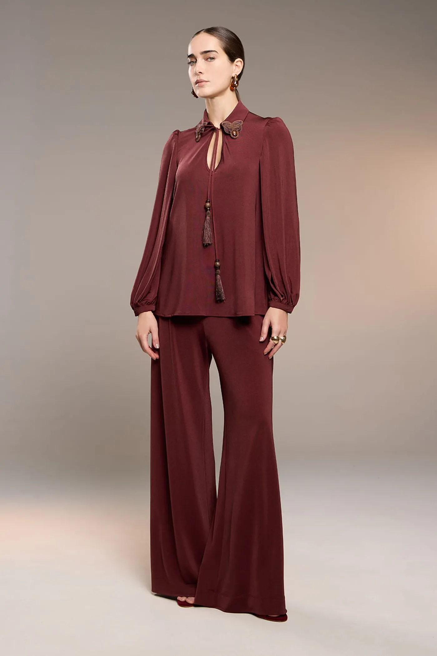 Camisa de modelagem ampla e fluida, que traduz com elegância o equilíbrio entre conforto e estilo. Confeccionada em malha jersey, apresenta caimento leve e movimento natural, enquanto a silhueta diferenciada confere um toque contemporâneo ao design. O grande destaque está nas aplicações bordadas na gola, que adicionam um charme artesanal e exclusivo à peça. As tiras para amarração no decote, finalizadas com ponteiras delicadas, valorizam o acabamento com sutileza. As mangas com aberturas laterais reforçam a fluidez e trazem leveza ao visual, tornando a peça versátil e sofisticada para diversas composições.