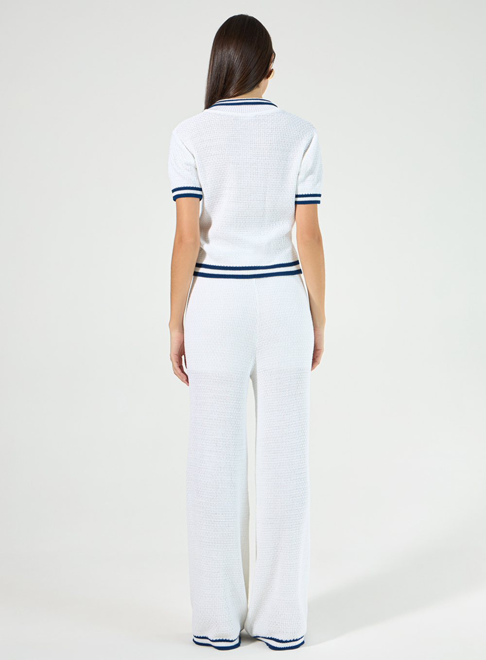 O tom off white com acabamentos em azul marinho reforça a proposta atemporal e refinada da coleção. O decote em V com gola polo adiciona um toque moderno e feminino, valorizando o colo com sutileza e sofisticação. As mangas curtas oferecem frescor e praticidade, enquanto o barrado com listras contrastantes traz um charme especial que eleva o visual.