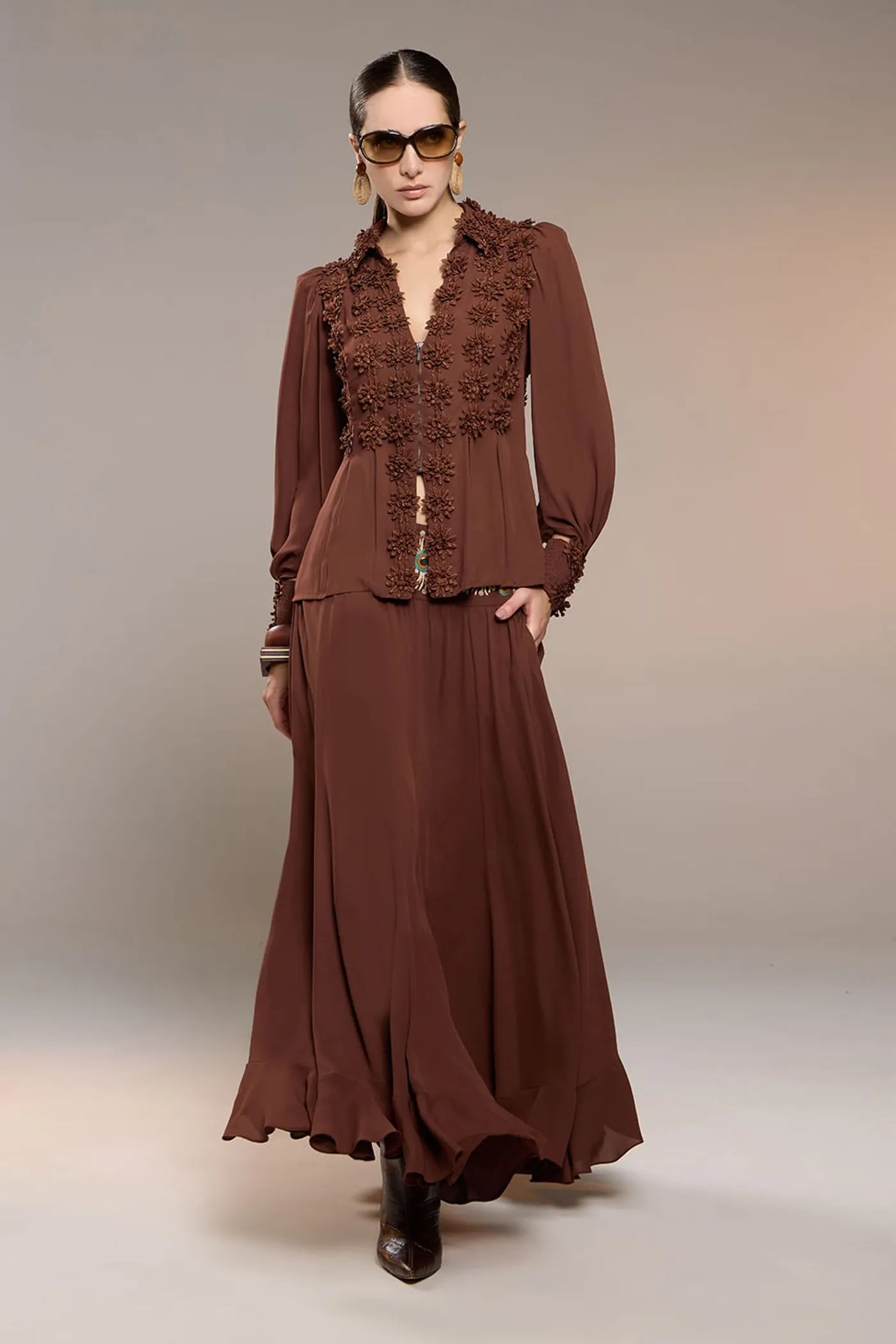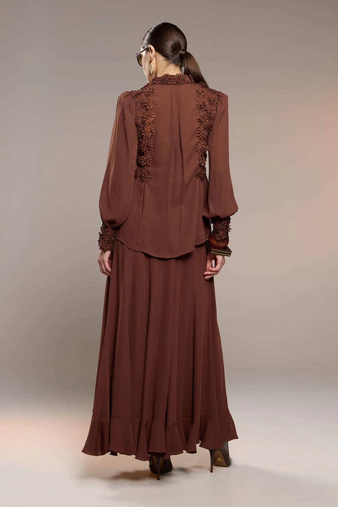 Esta blusa em chiffon leve, em tons de creme e marrom, revela uma estética delicada e sofisticada por meio de sua construção rica em detalhes. A aplicação de renda floral ao longo da peça cria textura e profundidade, conferindo um visual romântico e elegante.