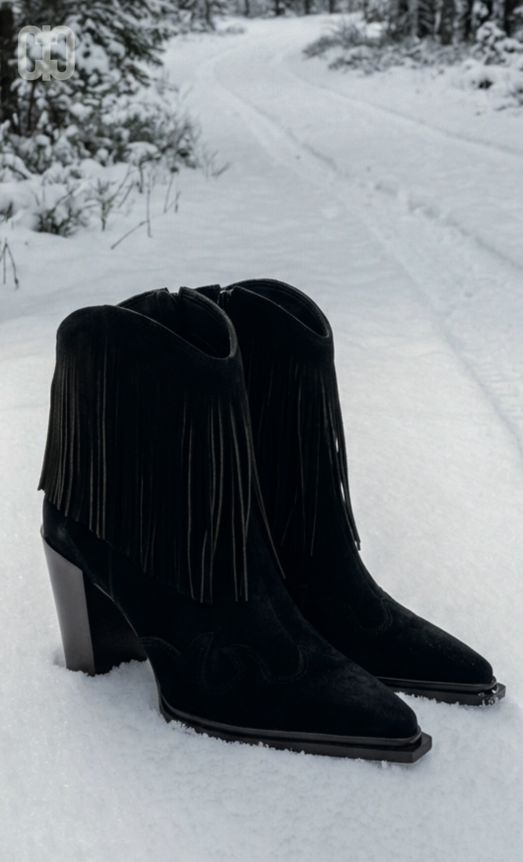 Bota de salto em suede com inspiração western, trazendo personalidade e sofisticação em cada detalhe. O modelo apresenta franjas longas no cano, que adicionam movimento e um toque de atitude à peça, enquanto o bico levemente quadrado e o salto robusto garantem modernidade e conforto. O acabamento impecável e a textura aveludada elevam o visual, tornando a bota perfeita para composições elegantes com um toque fashionista. Uma escolha versátil que transita com facilidade entre produções urbanas e propostas mais marcantes.