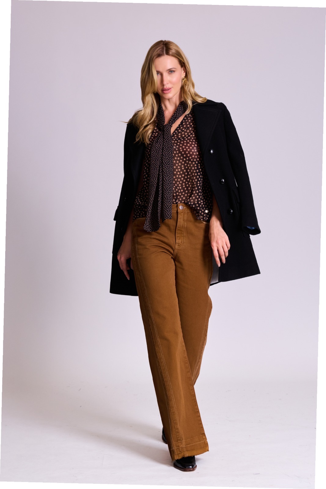 Calça caramelo com modelagem que alonga a silhueta, moderna e cheia de estilo.