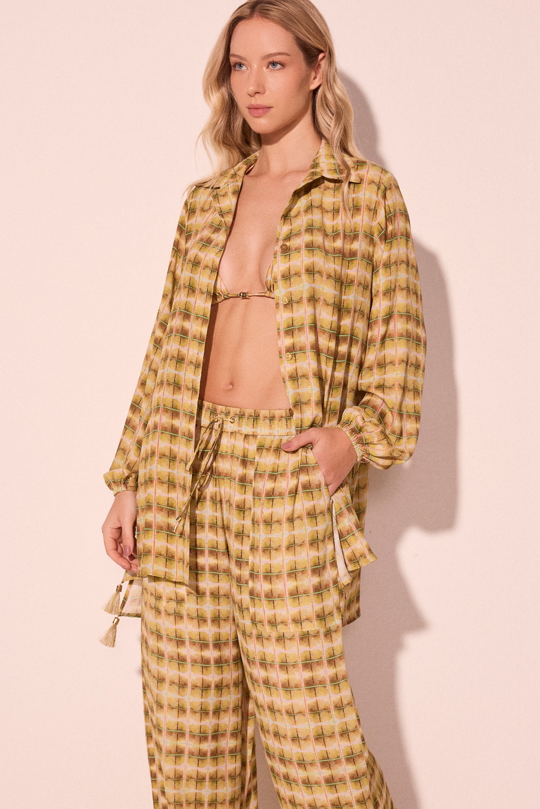 Calça pantalona com estampa quadriculada em nuances quentes, que mistura tons terrosos de forma harmoniosa e sofisticada. A padronagem cria um efeito visual marcante e contemporâneo, trazendo personalidade à peça com elegância atemporal.