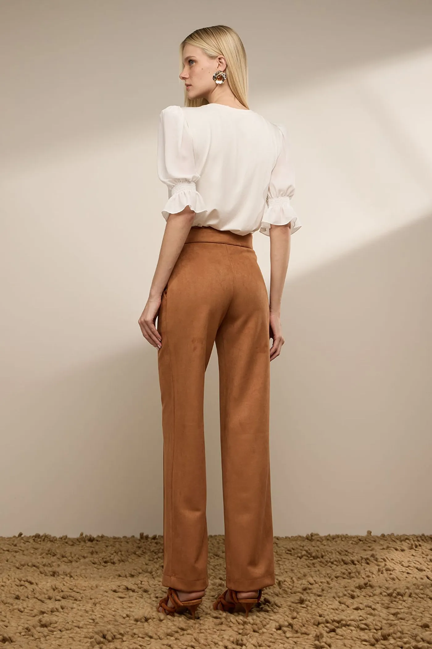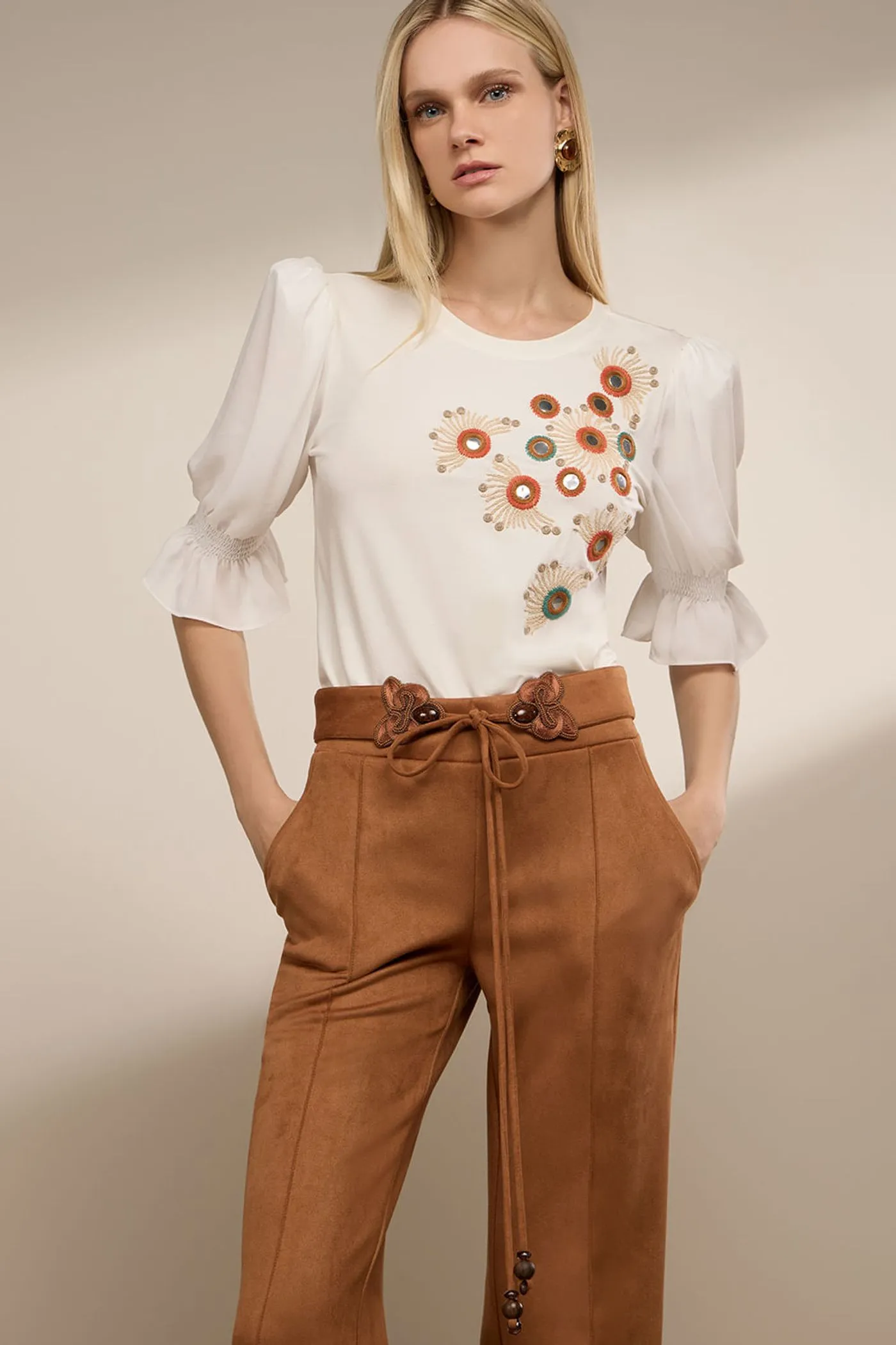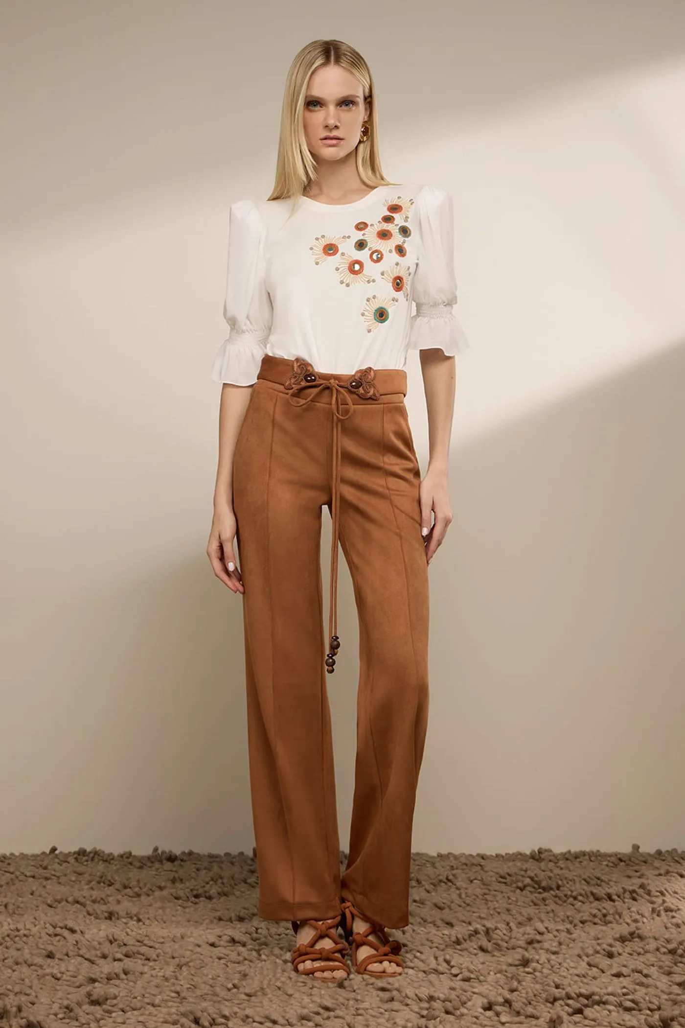 Calça em tecido nobu, nos tons de império, azeite e caramelo, de caimento impecável. Possui modelagem confortável com bolsos laterais funcionais, que unem praticidade e elegância no dia a dia. O destaque fica por conta da faixa avulsa para amarração na cintura, que permite diferentes formas de uso e valoriza a silhueta. A peça é finalizada com aviamentos bordados delicados e ponteiras refinadas, trazendo um acabamento artesanal e exclusivo. Uma calça versátil e atemporal, perfeita para composições que transitam entre o elegante e o contemporâneo.