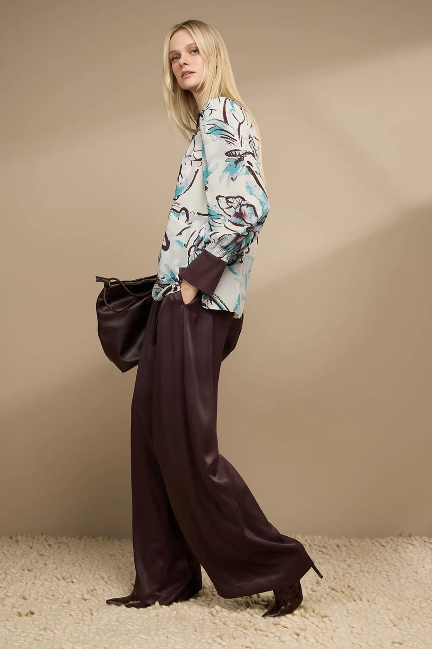 Calça pantalona em tecido acetinado no tom terra, com caimento elegante e detalhes delicados