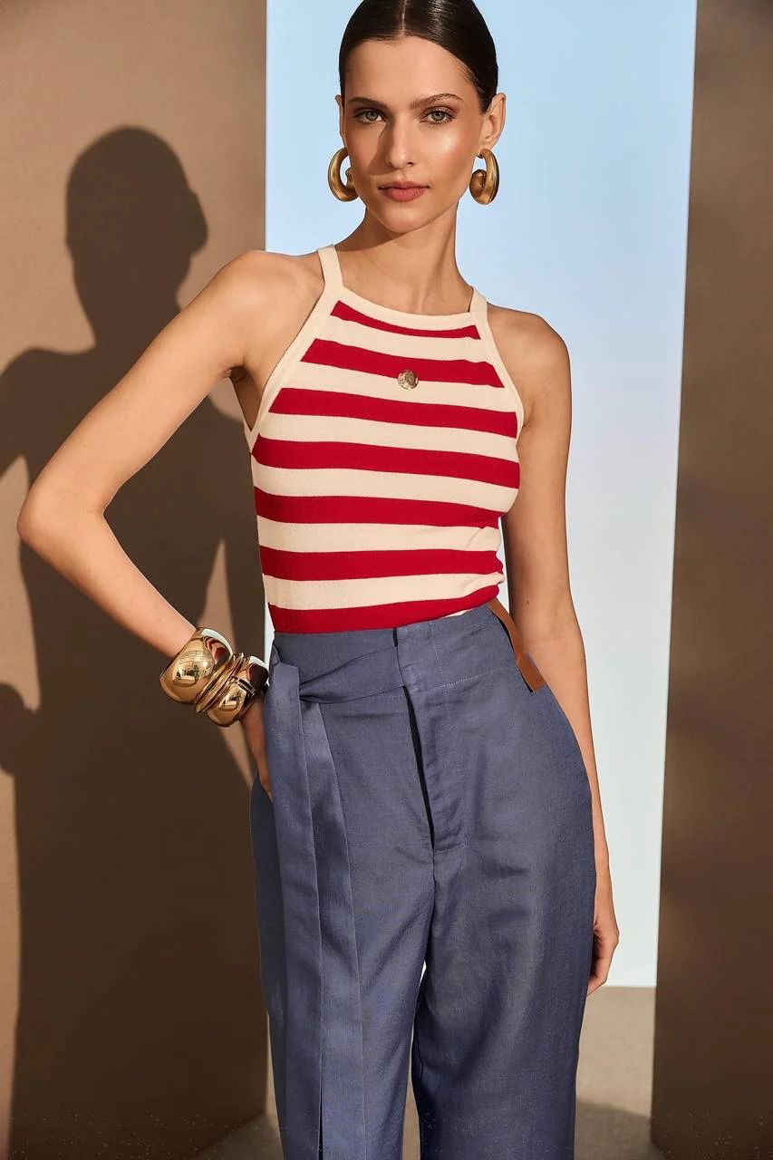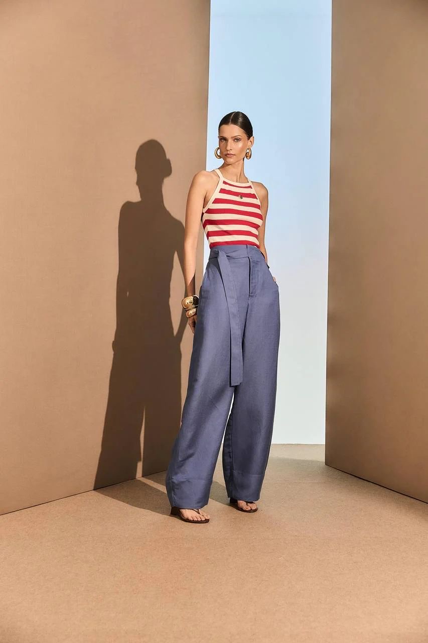 Com shape amplo e cintura marcada, a calça de alfaiataria em azul tem cinto faixa no mesmo tecido e barra italiana, unindo elegância e personalidade. A modelagem soltinha proporciona conforto com sofisticação — perfeita para looks urbanos que não abrem mão de estilo.