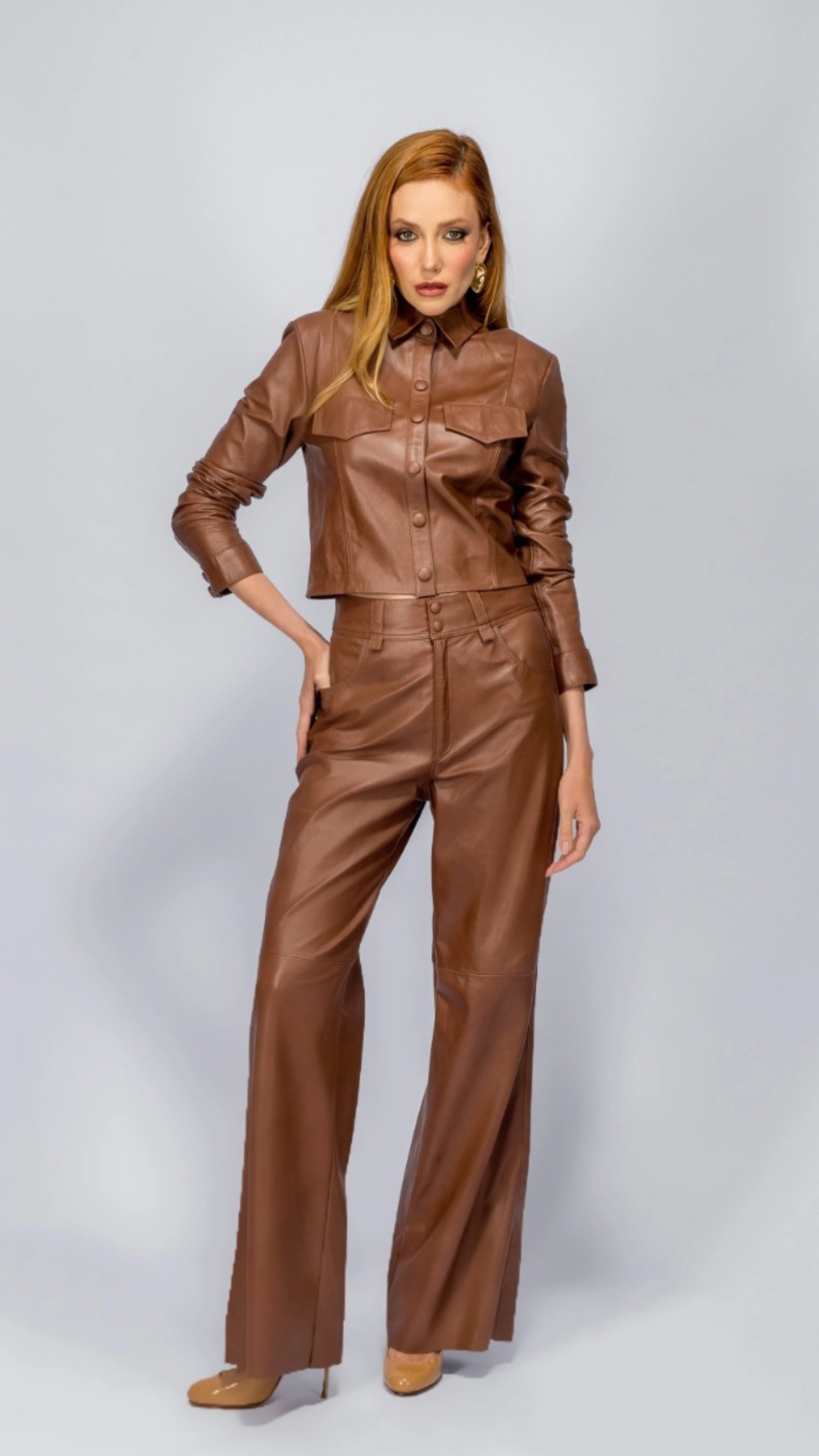 Calça pantalona de couro com modelagem reta, cós marcado e bolsos funcionais. O fechamento em dois botões e zíper confere acabamento impecável a uma peça elegante e atemporal.