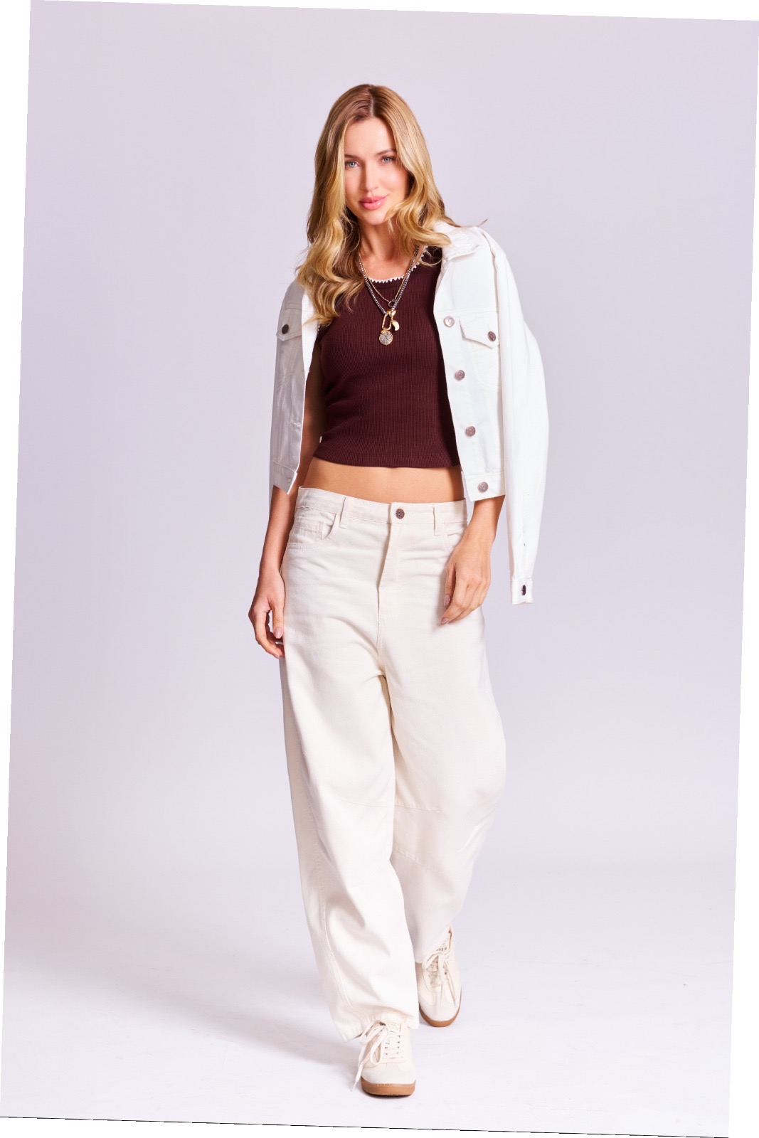 Calça de modelagem ampla, confortável e moderna, em tom neutro que combina com tudo.