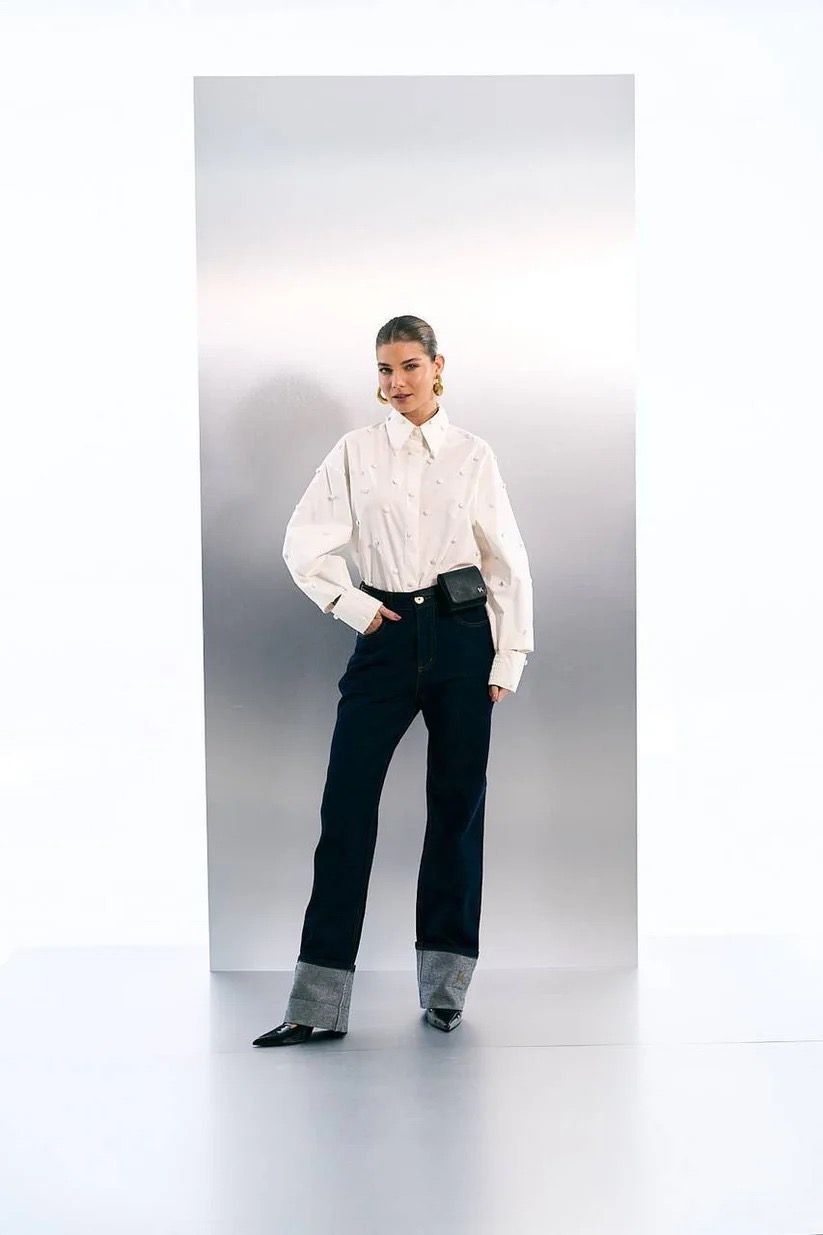 Camisa de mangas longas com leve volume nas mangas, punho ajustável com abertura e bordados