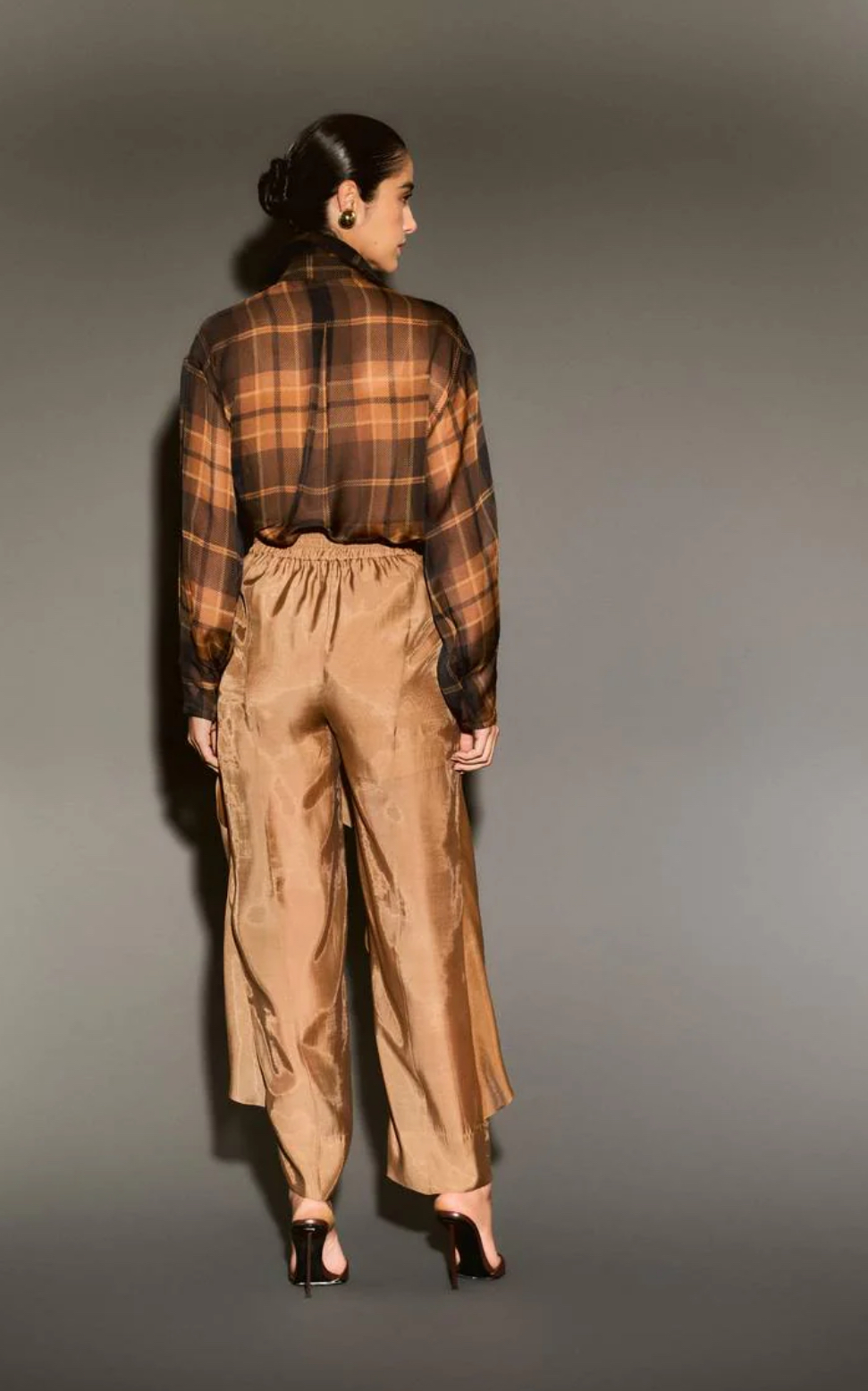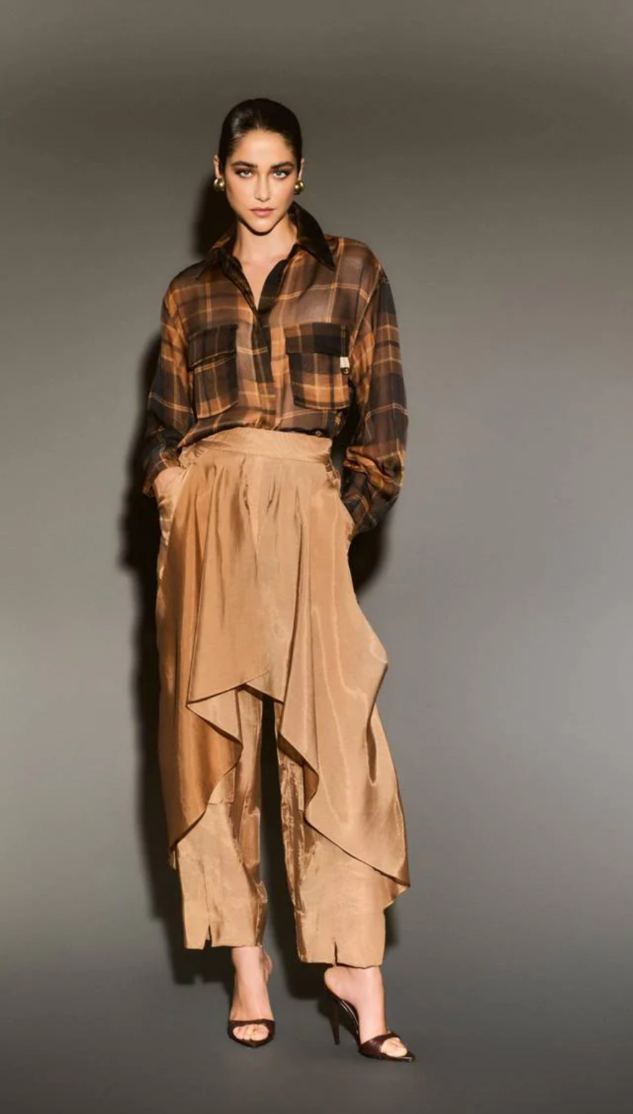 Camisa em tecido leve e translúcido com estampa xadrez. Construção de alfaiataria com colarinho clássico, vista com botões e punhos ajustáveis. Shape levemente oversized, ombro sutilmente deslocado e barra arredondada que alonga o look. Bolsos frontais com pala trazem leitura utilitária; um deles recebe tira em tecido liso com ferragem em D-ring, detalhe que atualiza a peça e dá contraste de textura. Acabamentos limpos mantêm o caimento fluido — perfeita como terceira camada sobre tops minimal ou fechada, por dentro de jeans e alfaiataria.