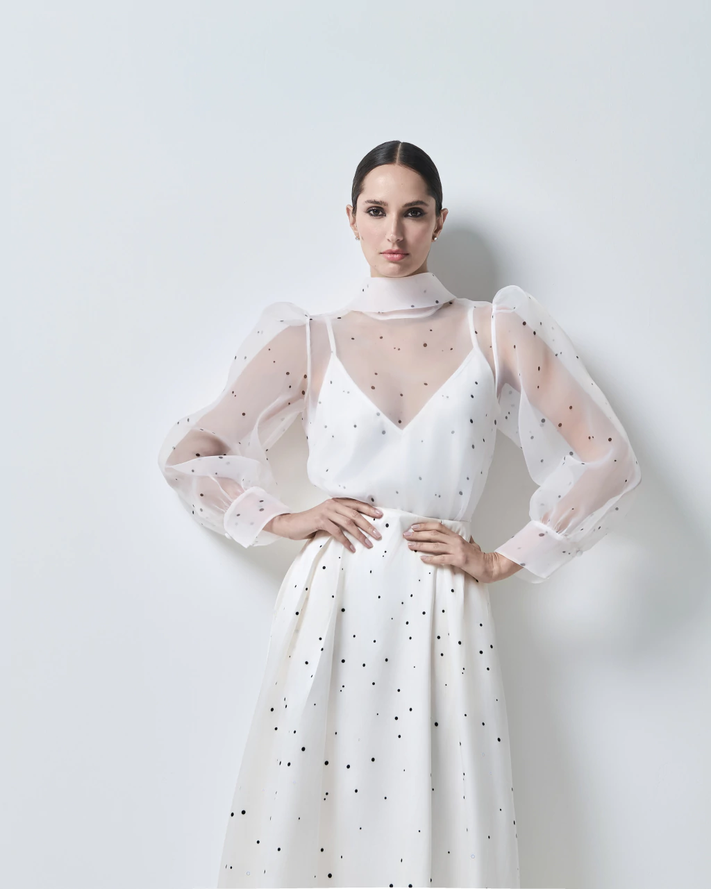 Camisa em organdy transparente com poá, mangas bufantes e gola alta com faixa removível. Leve, elegante e versátil para sobreposições.