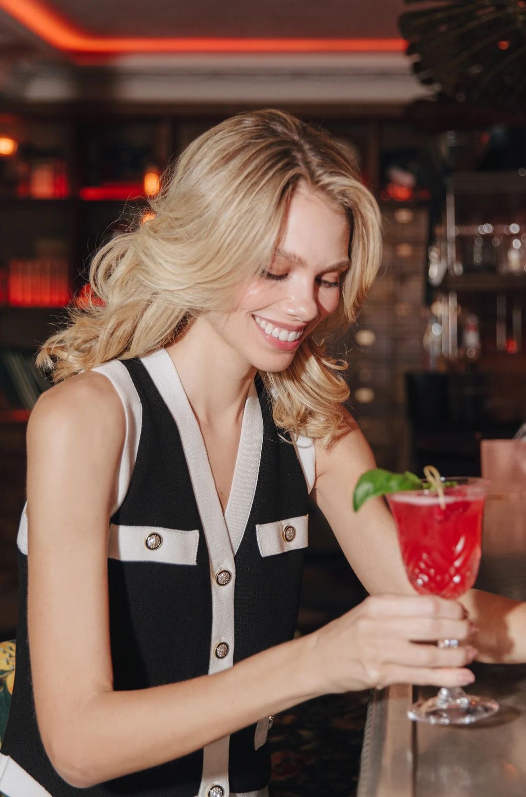 Perfeito para Compor Looks Cheios de Estilo e Sofisticação, o Colete Tricot Black e White É Uma Peça-Chave da Nossa Nova Coleção. com Uma Modelagem Clássica e Elegante, Ele É Ideal para Sobreposições e para Dar Um Toque Final a Qualquer Produção. o Tricot de Alta Qualidade Garante Conforto e Um Caimento Impecável, Enquanto Os Botões Dourados com Aplicação de Cristais No Fechamento Frontal Adicionam Um Brilho Sutil e Luxuoso. Versátil, Ele Pode Ser Usado em Diversas Ocasiões, do Casual Ao Mais Arrumado