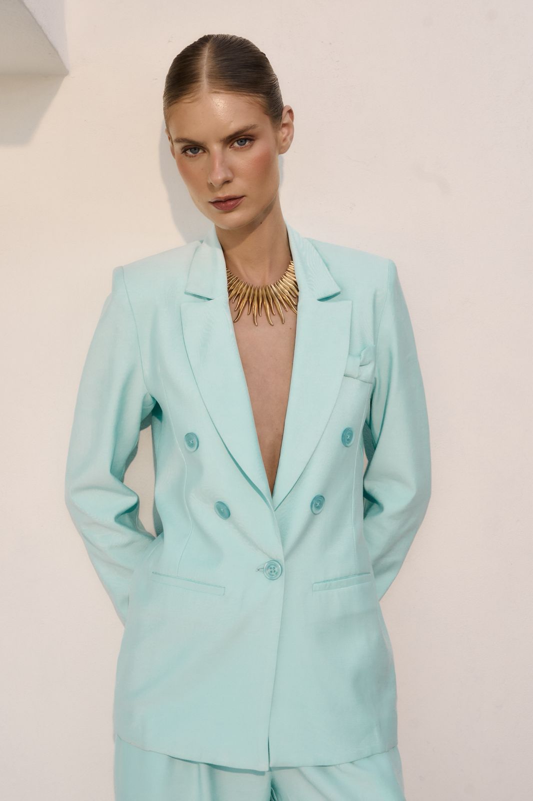 Conjunto de alfaiataria em tom verde menta, composto por blazer e calça, que traduz sofisticação contemporânea com acabamento impecável. O blazer possui modelagem estruturada, fechamento transpassado com botões forrados, lapela clássica e decote profundo, valorizando a silhueta com elegância. A calça de alfaiataria apresenta corte reto e caimento fluido, proporcionando conforto e alongamento visual. Um conjunto versátil e marcante, ideal para produções elegantes que transitam do dia à noite com estilo e personalidade.