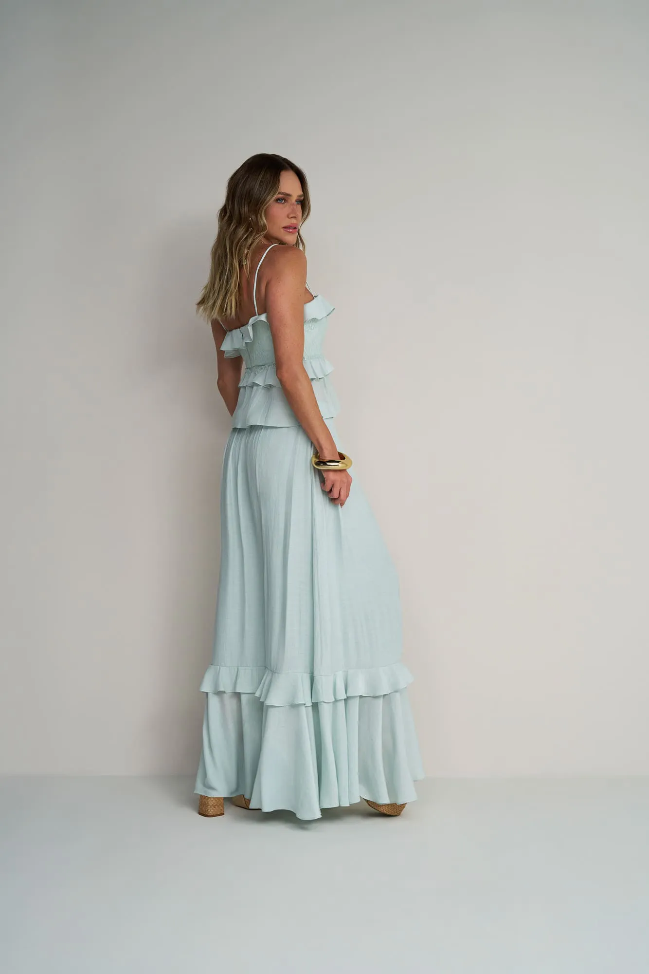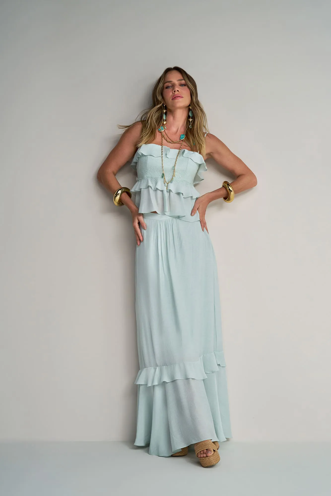 Conjunto Verde Água Blusa com Renda e Saia Longa