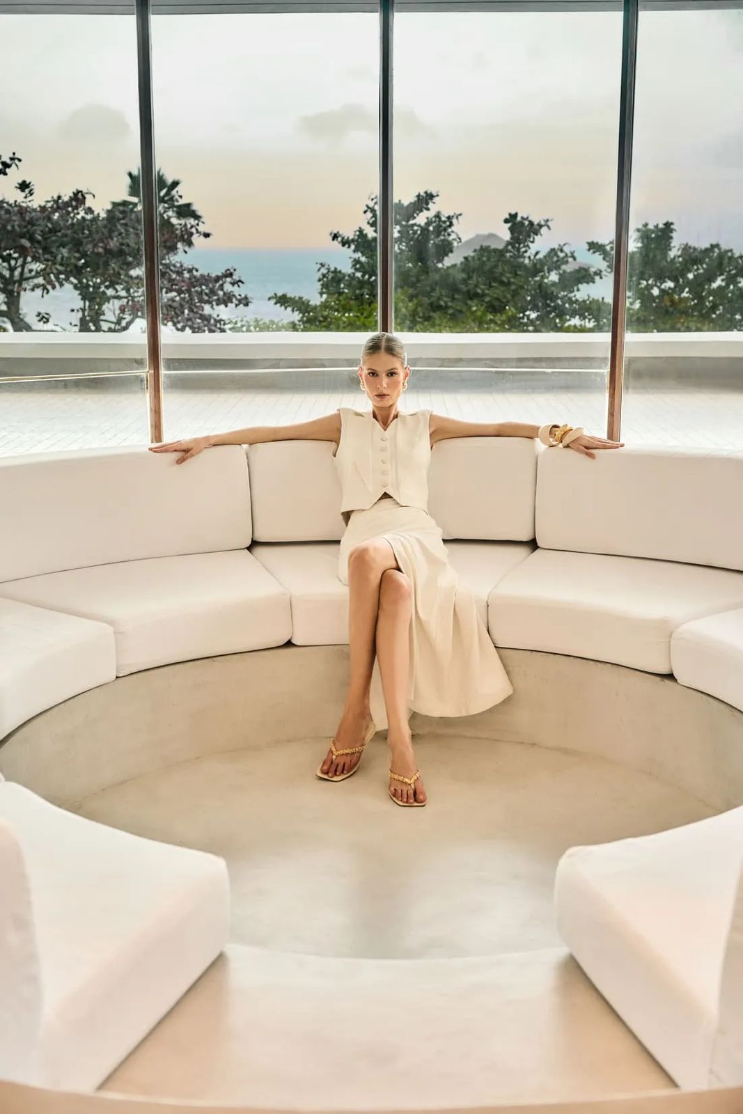 Colete lapela com ombros estruturados e saia midi com fenda frontal