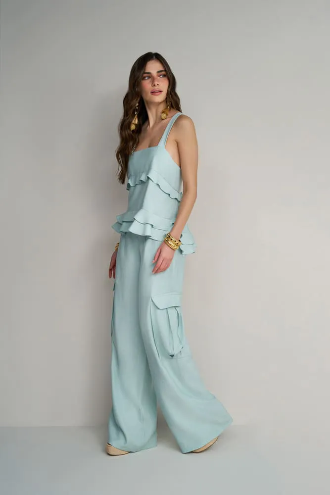 onjunto Verde Água Blusa de Babado e Calça Cargo