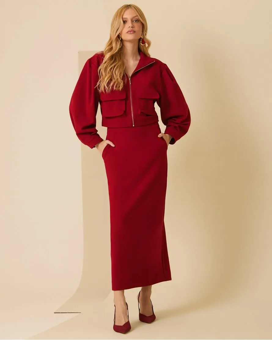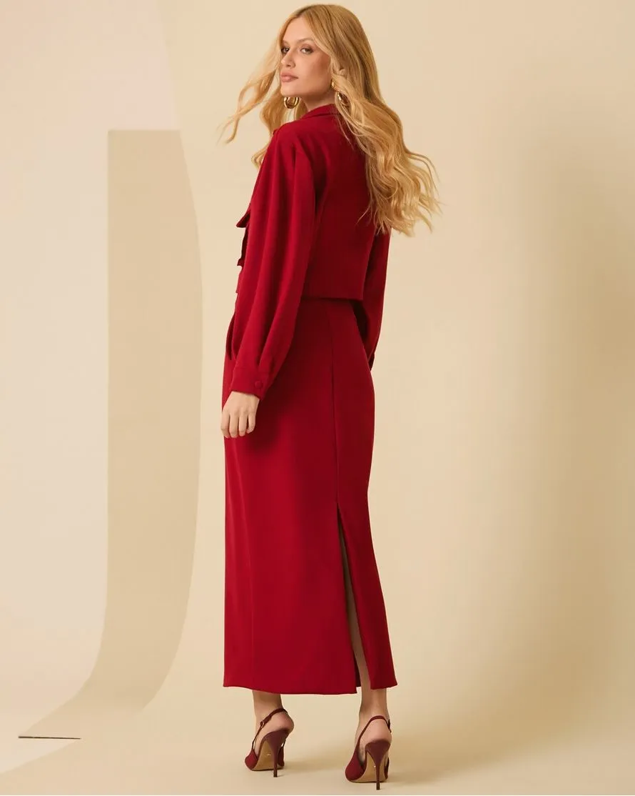Conjunto Ruby Red em alfaiataria sarjada com jaqueta utilitária e saia midi evasê de caimento elegante