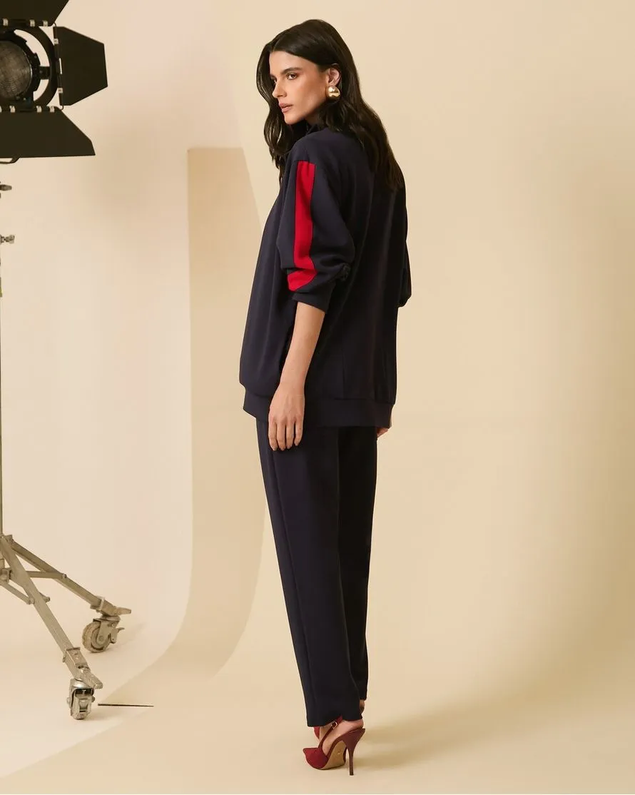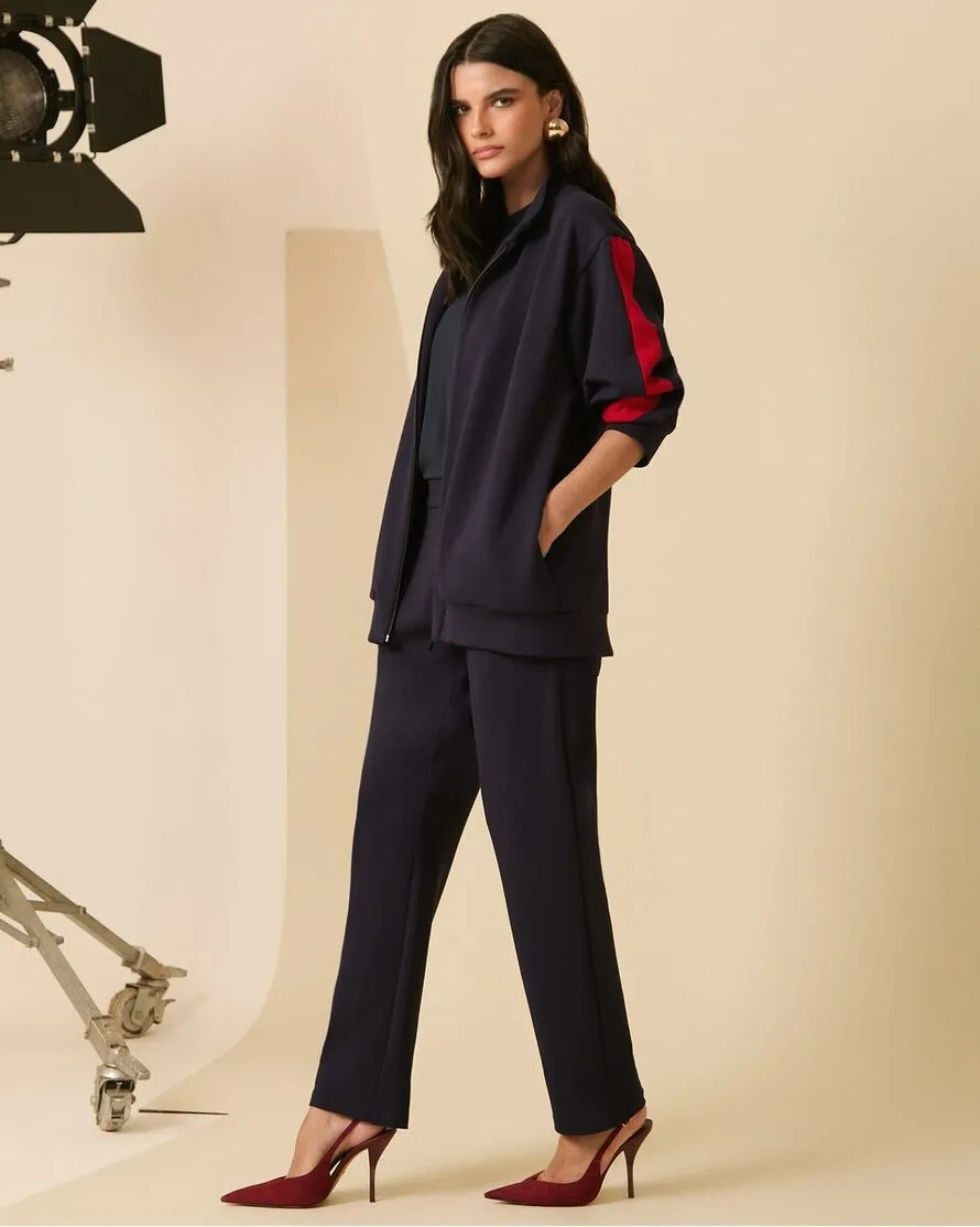 O Conjunto Athleisure Casaco e Calça une conforto e estilo em uma proposta moderna e versátil. Confeccionado em malha power, o casaco possui modelagem estruturada com mangas longas e detalhes em vermelho, além de pregas nos punhos que adicionam um toque diferenciado. Conta com gola, bolsos frontais funcionais, fechamento em zíper preto na parte frontal e forro interno, garantindo melhor acabamento e conforto ao vestir.