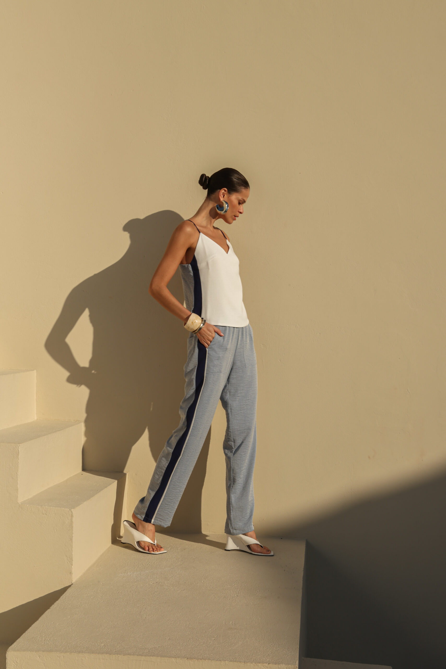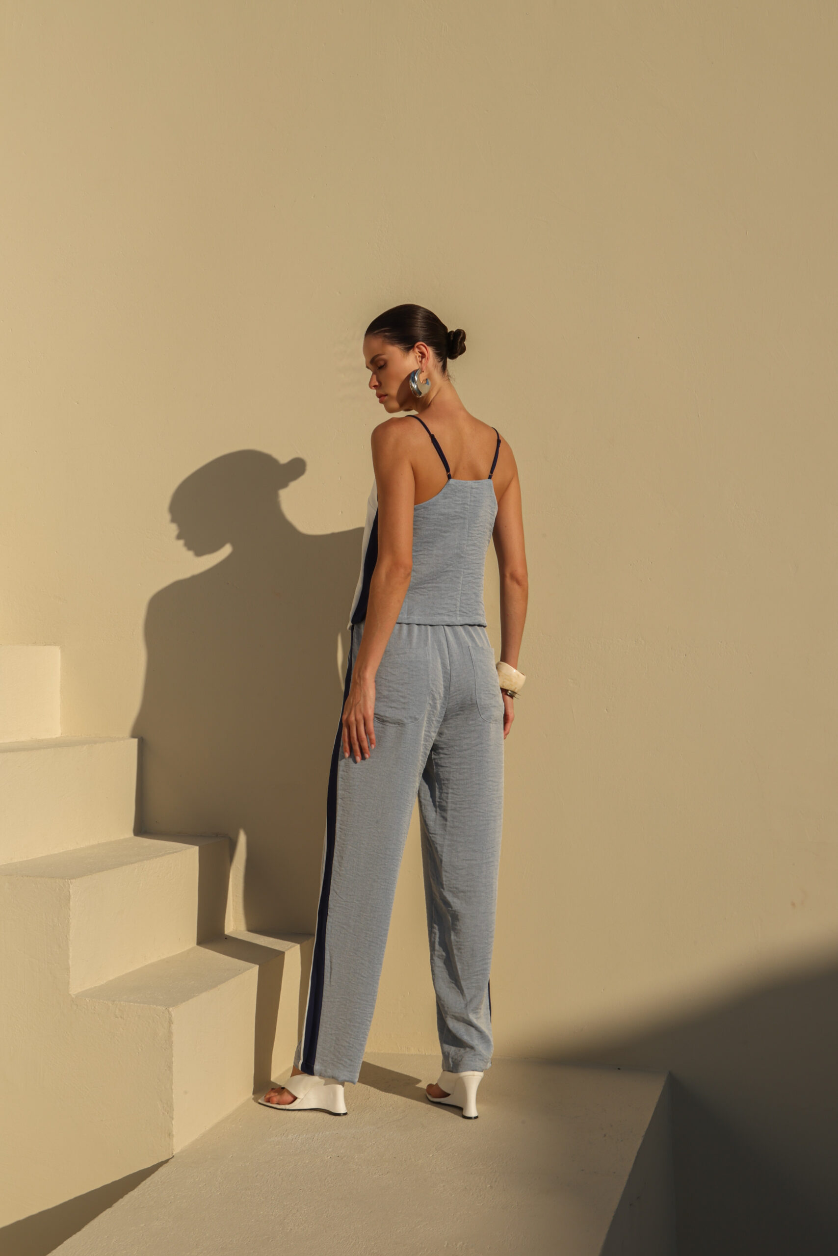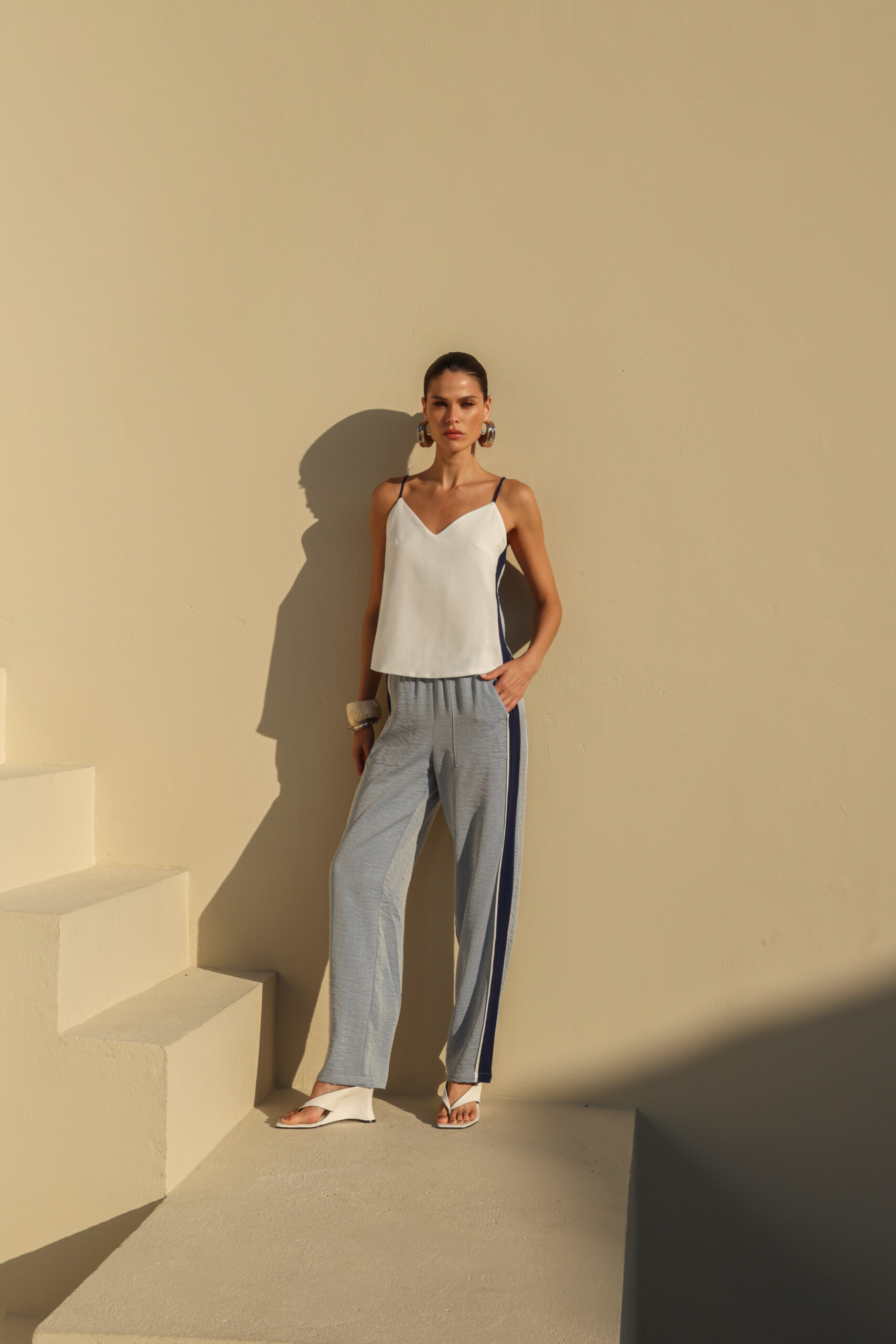 Conjunto sofisticado composto por calça de modelagem reta, com bolsos frontais e listras laterais em elastano que conferem charme e alongamento à silhueta. As mesmas listras se estendem à blusa, criando perfeita harmonia entre as peças. A blusa, leve e delicada, apresenta alças finas, decote em V e frente lisa, enquanto as costas exibem a estampa das listras, revelando um contraste moderno e elegante.
