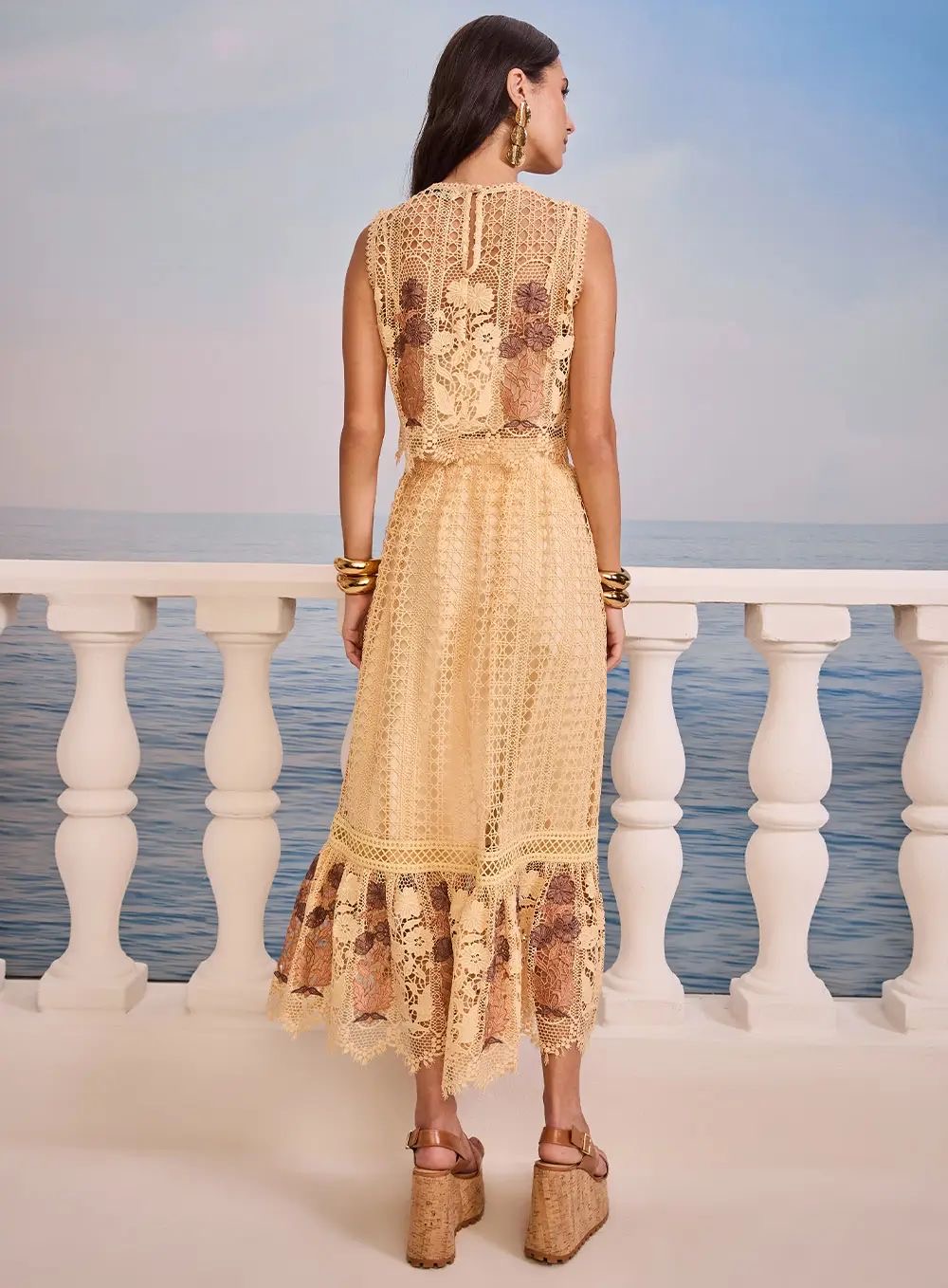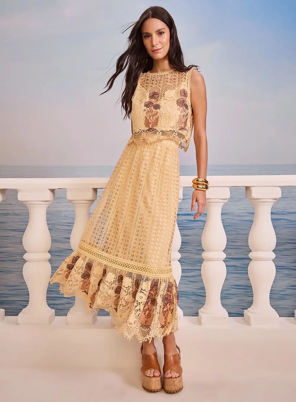 Conjunto composto por renda delicada e bordados , blusa sem manga e saia midi