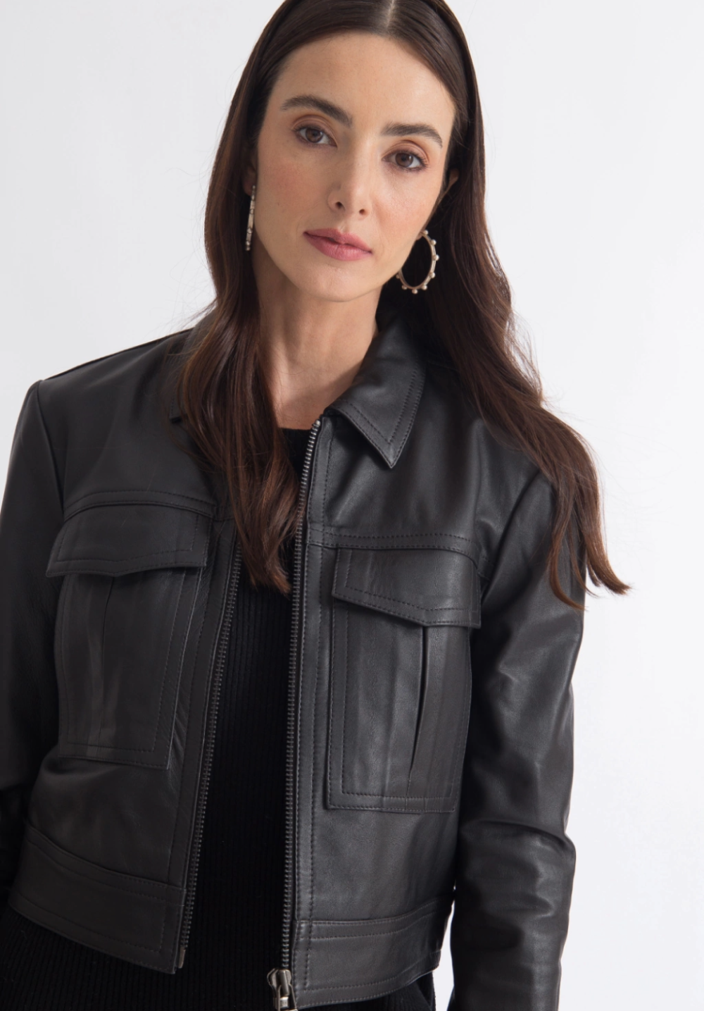a Jaqueta Basic Bolsos é uma jaqueta de couro feminina que combina estilo e funcionalidade atemporal
