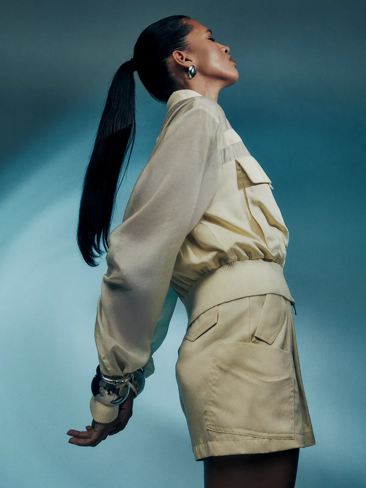 Jaqueta que une o acetinado do Silk Touch à leveza da transparência, com shape soltinho, zíper metálico
