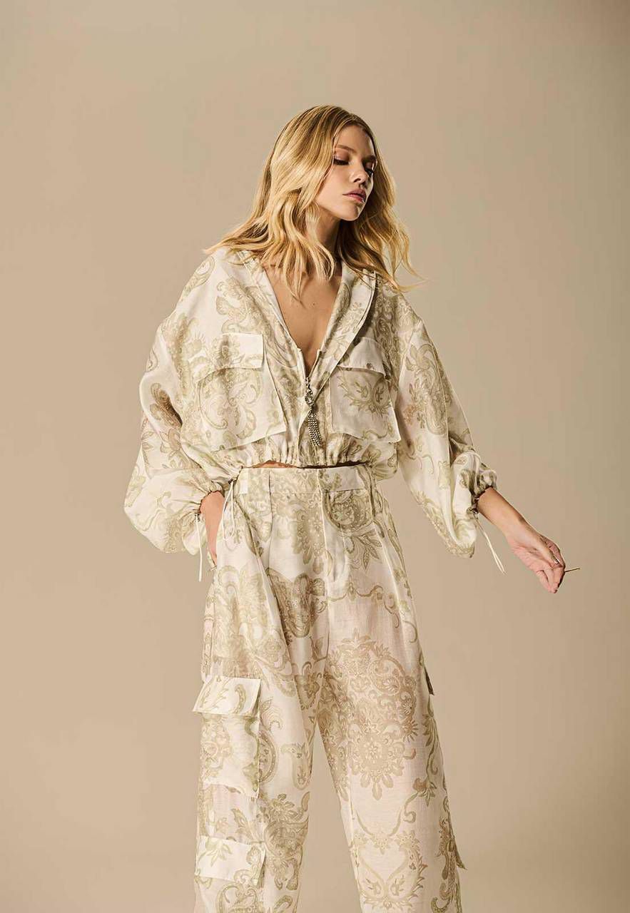 A Jaqueta Organza Paisley com Reguladores une leveza e estilo urbano em uma proposta ousada e moderna. Com estampa delicada em tom bege sobre a organza translúcida, a peça traz frescor para os dias quentes sem abrir mão da informação de moda. O comprimento cropped, aliado ao elástico ajustável na barra e punhos, valoriza a silhueta e adiciona praticidade. Os bolsos utilitários e o capuz finalizam o design com um toque despojado, ideal para composições casuais que fogem do óbvio.