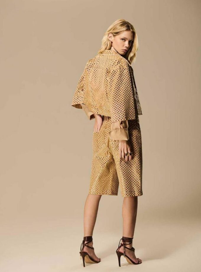 Jaqueta estilosa em sarja de algodão estampado. Possui bolsos frente, botões forrados e bordado especial nas costas.