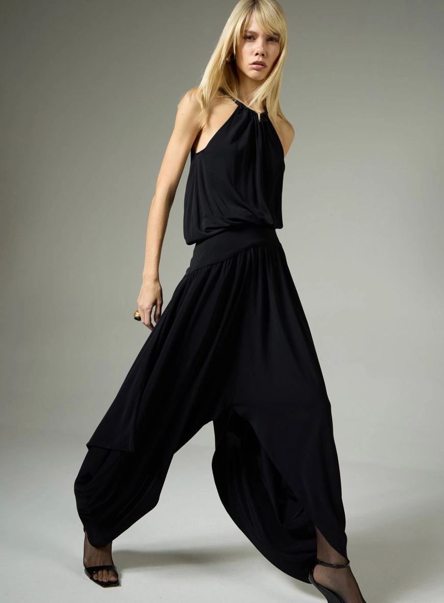 Macacão em viscose com toque macio e caimento leve. Possui drapeado na parte superior, modelagem ampla e barra assimétrica