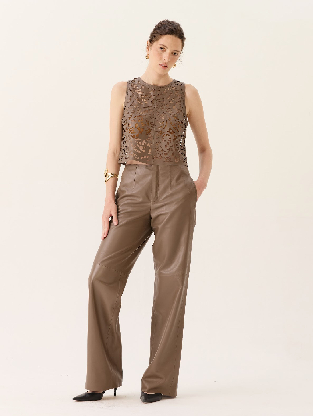 Blusa confeccionada em couro com acabamento sofisticado e design contemporâneo. O grande destaque da peça é o trabalho em corte a laser, que cria desenhos orgânicos e vazados ao longo de toda a superfície, trazendo leveza e um efeito visual marcante. A modelagem reta com decote arredondado valoriza o colo com elegância, enquanto o caimento estruturado do couro garante presença e modernidade. Uma peça imponente e refinada, perfeita para composições elegantes e cheias de personalidade.