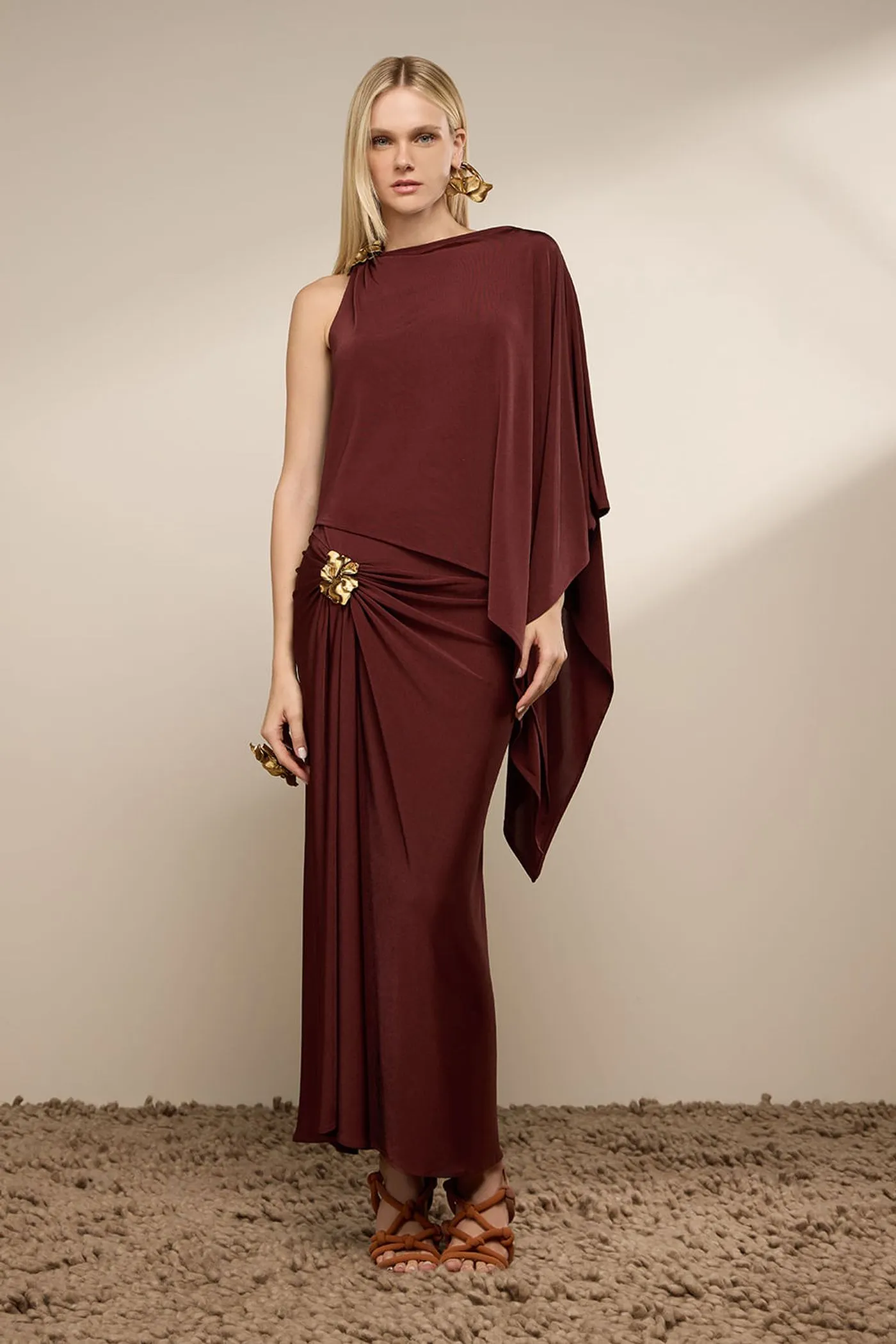 Saia maxi midi em malha jersey com franzido lateral e fivela dourada
