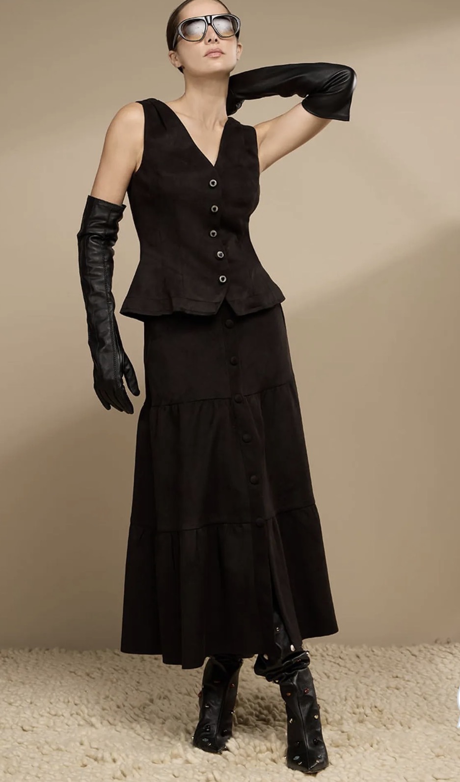 Possui botões forrados decorativos na parte frontal, detalhe estético que acrescenta charme e personalidade à peça. A modelagem conta com uma pequena fenda frontal, que garante movimento e feminilidade na medida certa, além dos bolsos laterais funcionais. Na parte posterior, o fechamento é feito por zíper invisível, proporcionando acabamento limpo e ajuste confortável. Atemporal, é ideal para composições que transitam com facilidade entre o casual sofisticado e produções mais elaboradas. A luva em couro é um acessório de styling.