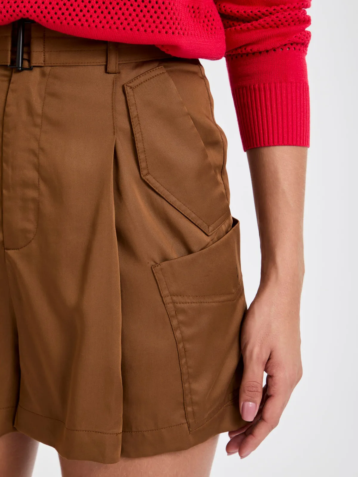 Bermuda em Silk Touch com caimento fluido, acabamento acetinado, cinto com fivela embutida e bolsos frontais