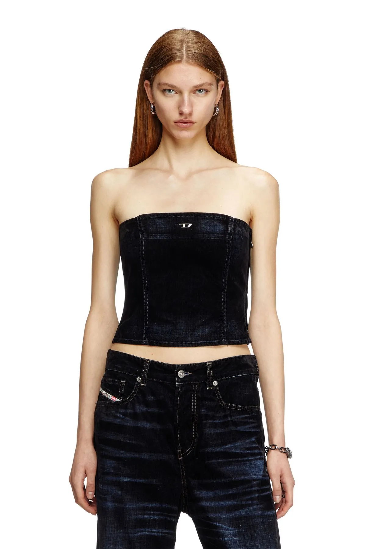 Top tomara que caia em jeans de lavagem escura, com detalhe no busto que remete ao cós de uma calça, incluindo passantes. Possui o logo da marca em acessório prateado e comprimento dividido por faixas verticais que formam uma barra estilizada.**