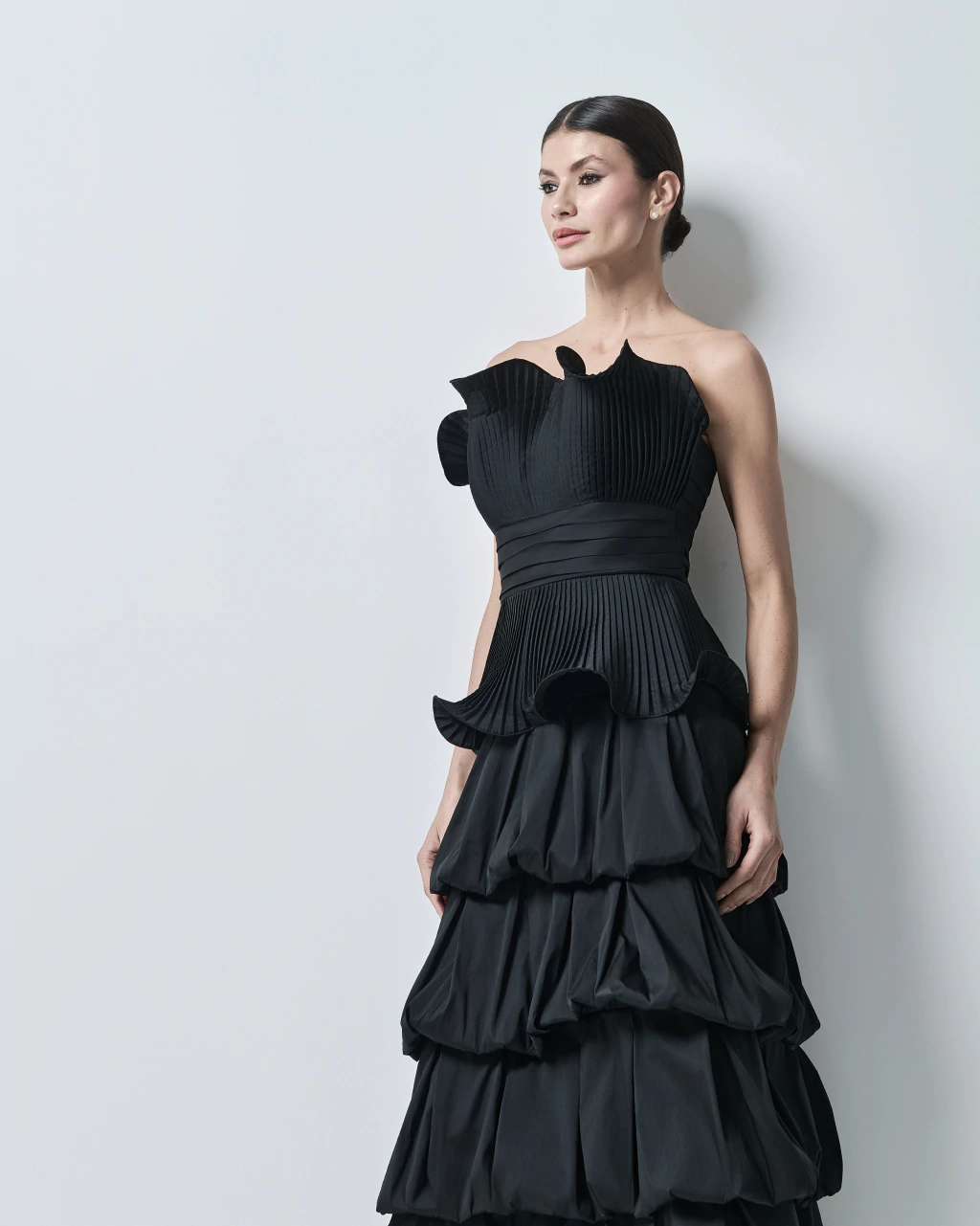 O decote orgânico com acabamento ondulado reforça a proposta autoral da peça, criando um visual marcante e moderno. A cintura é evidenciada por faixas estruturadas que definem a silhueta com precisão, enquanto o barrado em peplum traz equilíbrio ao conjunto, combinando firmeza e fluidez em um caimento harmonioso.