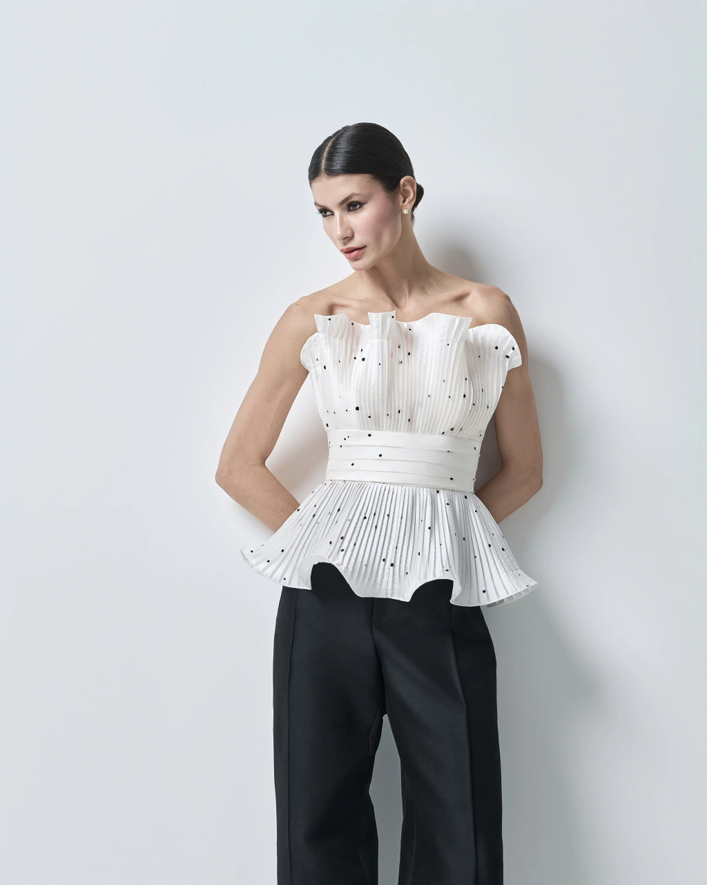 Top estruturado com plissado no busto, decote escultural e peplum, que cria uma silhueta marcante