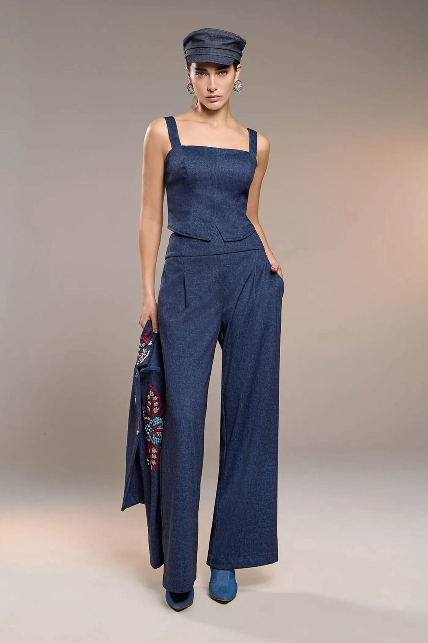 Top em estampa jeans, com visual moderno e acabamento estruturado que valoriza a silhueta.