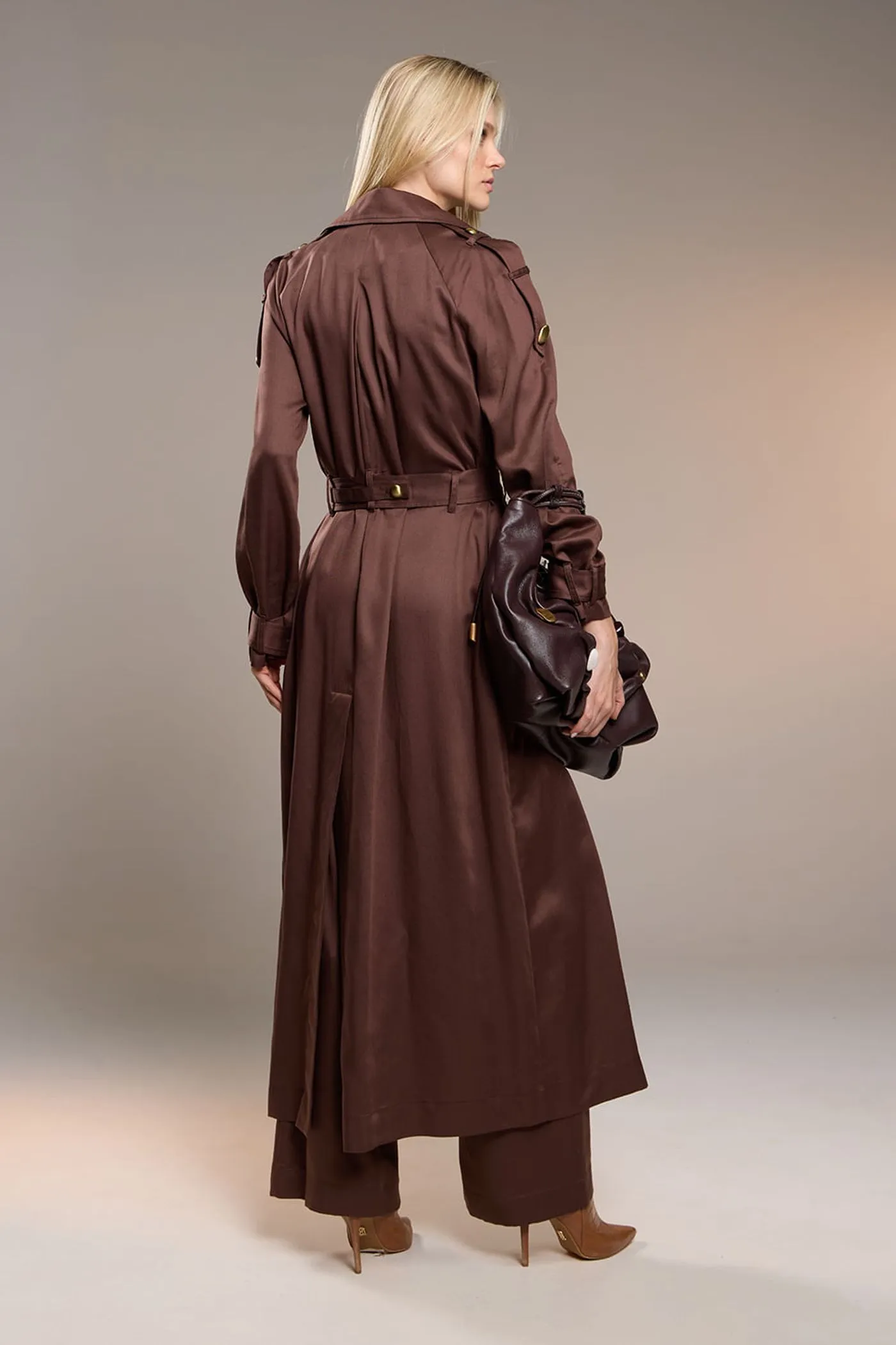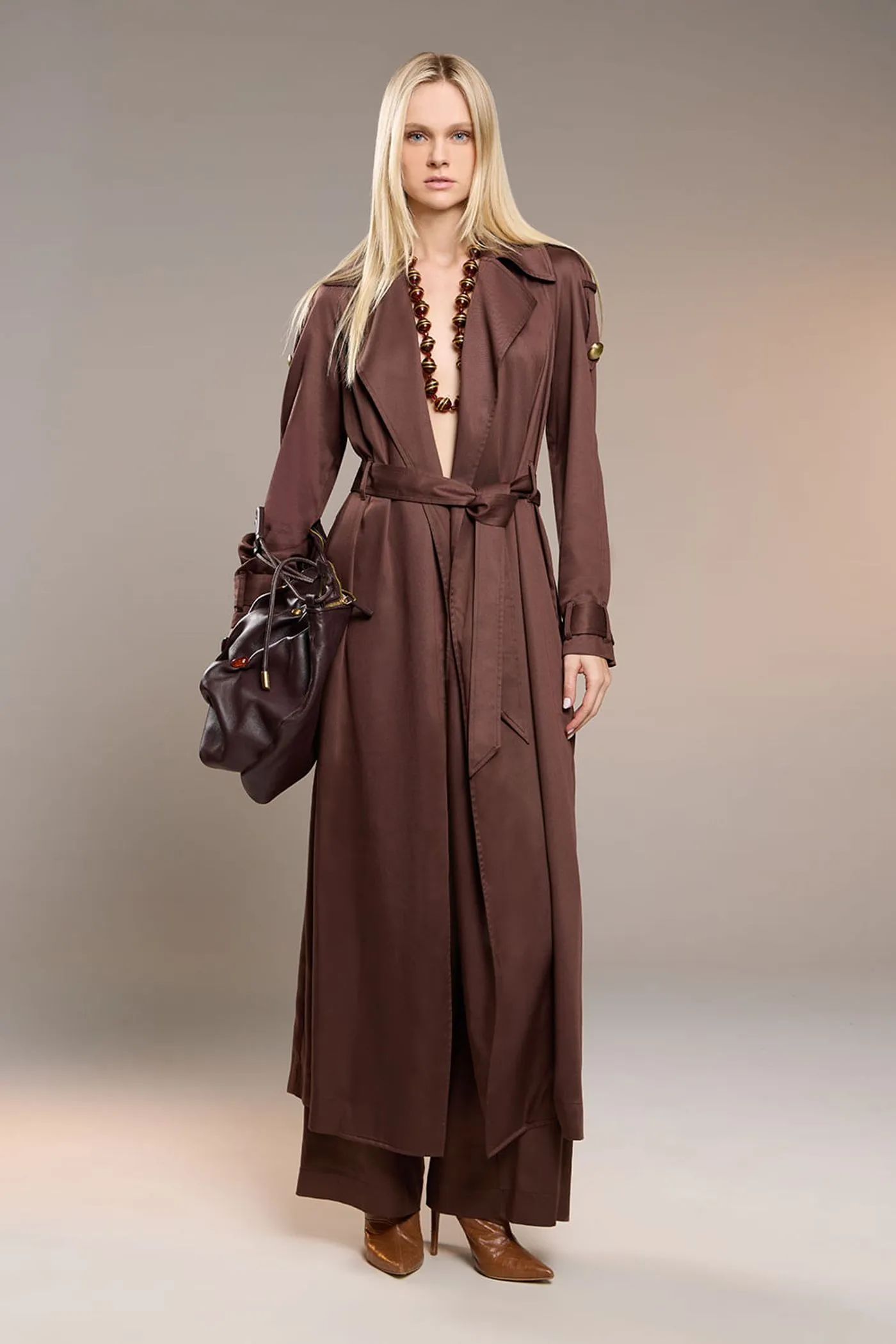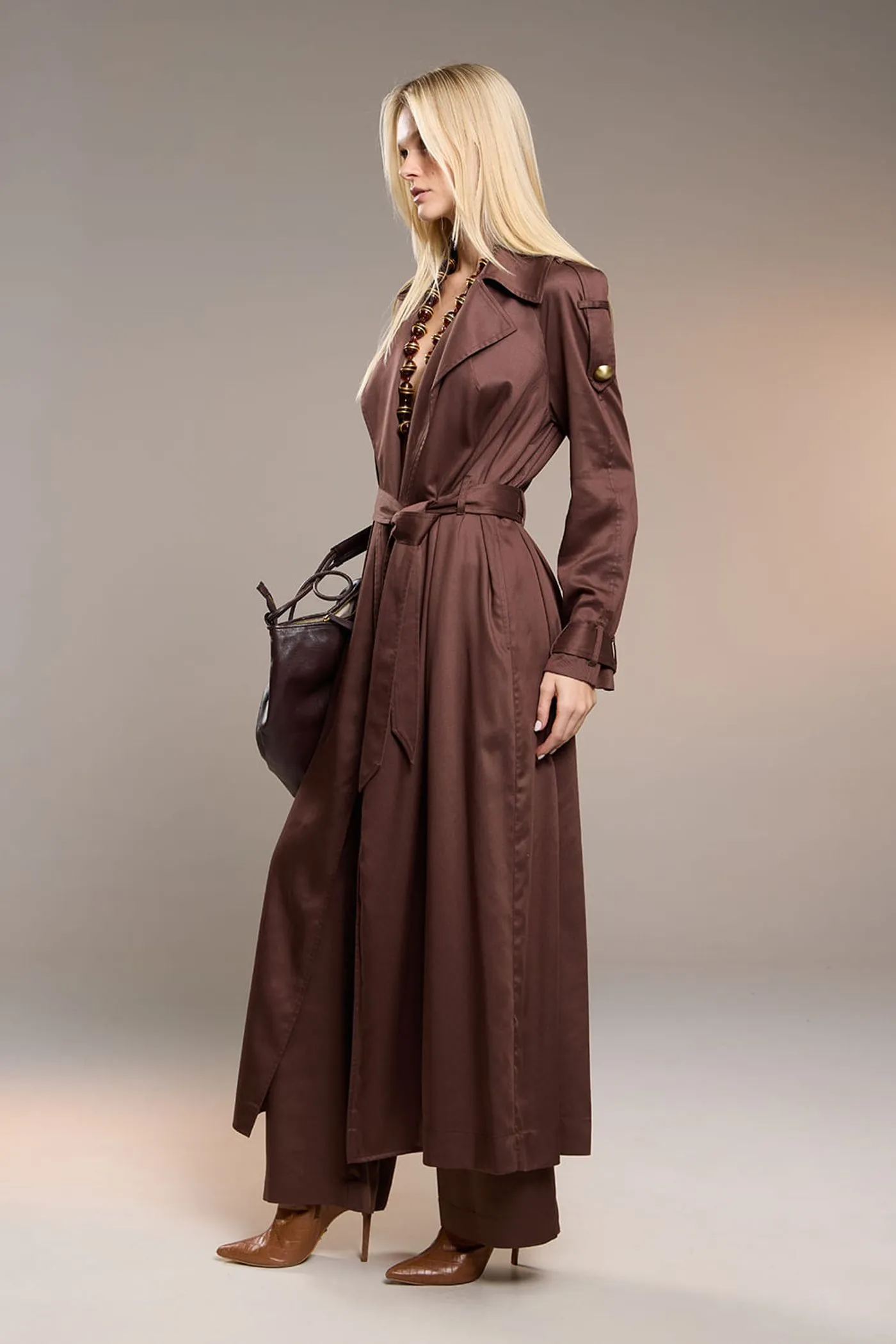 Trench coat longo confeccionado em tecido cannes na cor marrom, com caimento elegante e estrutura impecável. Possui modelagem clássica com faixa para amarração na cintura, valorizando a silhueta com sofisticação. O grande destaque está nos passantes aplicados nos ombros, punhos e também na faixa, finalizados com aviamentos metálicos em tom cobre que acrescentam personalidade e um toque contemporâneo à peça. Um item estiloso e versátil, perfeito para composições do dia à noite.