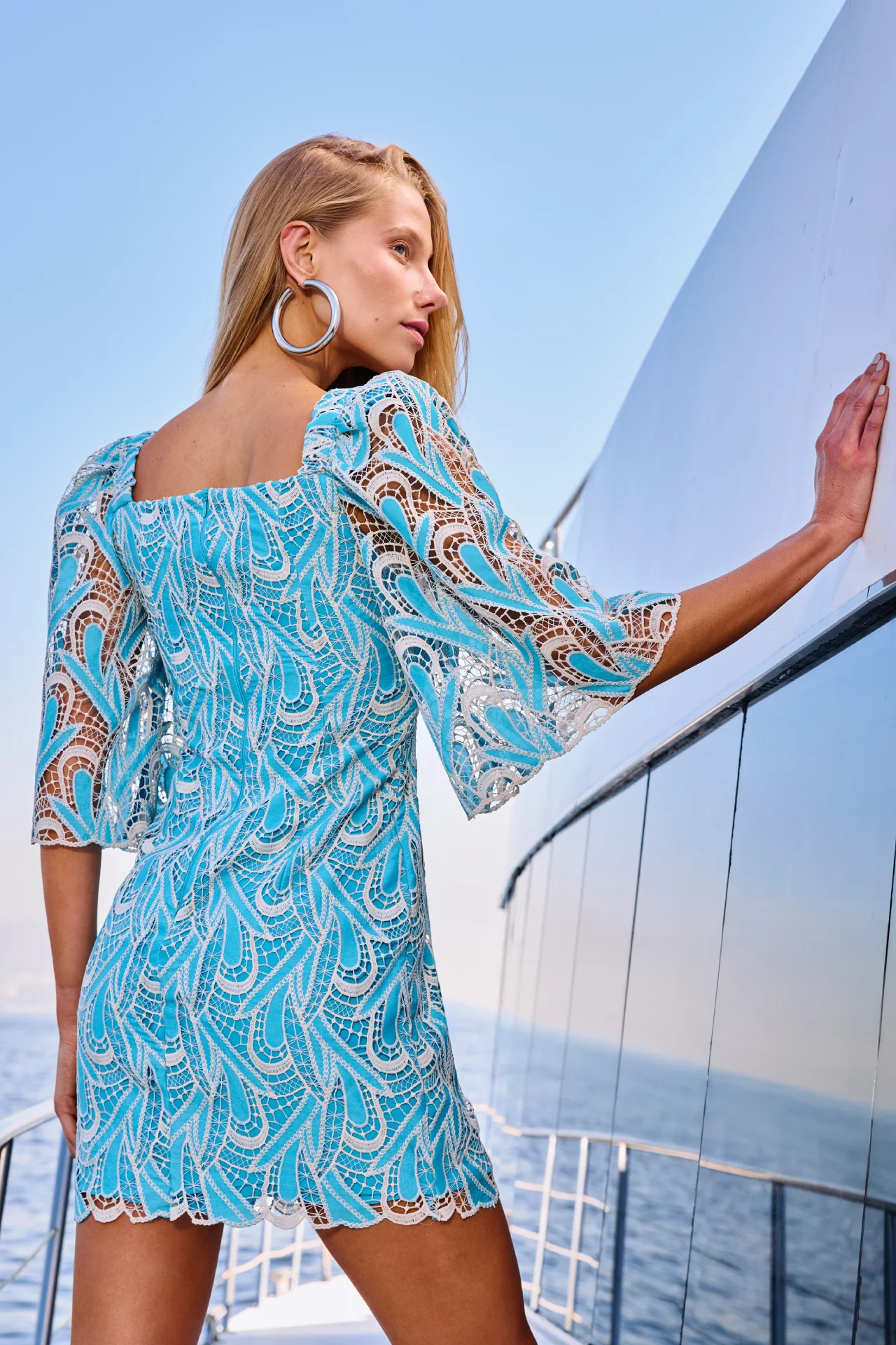 Vestido renda curto manga sino sofisticado.