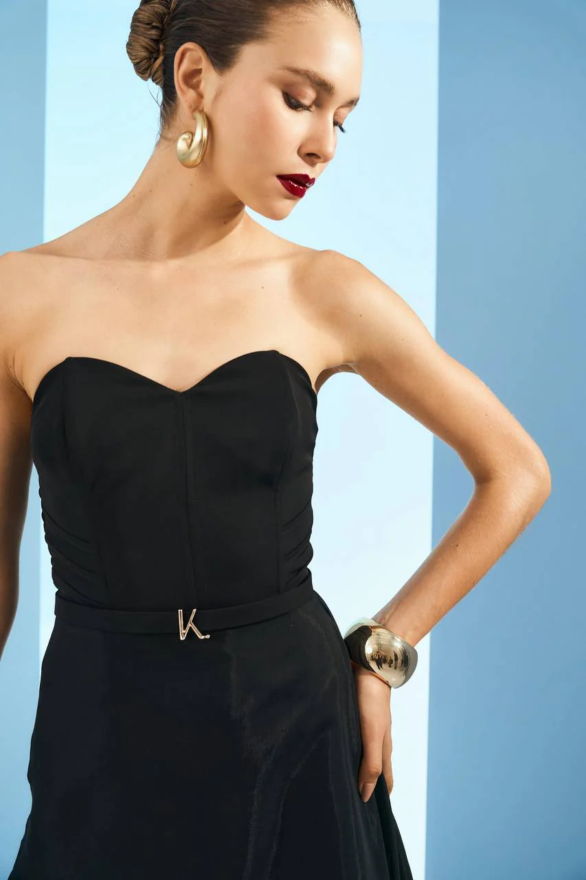 Vestido tomara que caia em tecido de alfaiataria leve com toque acetinado. A modelagem estruturada valoriza o busto com recorte em corset e cintura marcada por cinto fino com fivela metálica — um detalhe sutil que reforça o caráter sofisticado da peça. A saia assimétrica, com sobreposição translúcida em tule, cria movimento e revela uma sensualidade elegante, sem excessos. Um modelo que combina arquitetura e fluidez, traduzindo o equilíbrio perfeito entre força e delicadeza