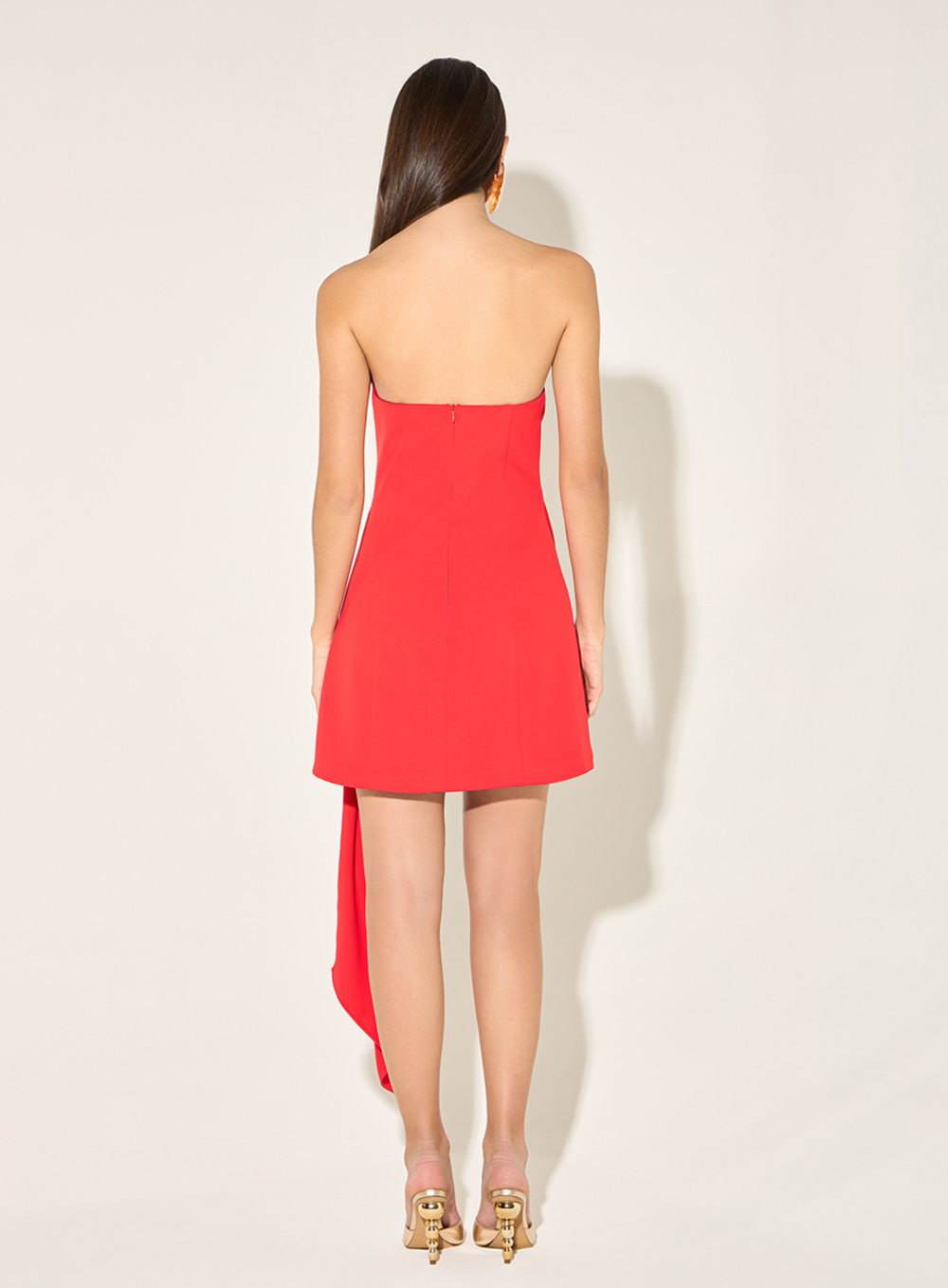 A modelagem tomara que caia com decote em V valoriza o colo e realça a silhueta com feminilidade e confiança. O destaque da peça está na sobreposição transpassada de tecido, fixada na lateral, que cria um drapeado sutil e é finalizada por uma faixa alongada, conferindo leveza e movimento ao visual.