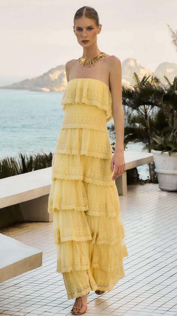 Leve, elegante e cheia de charme, esta peça traduz o espírito dos dias luminosos com sofisticação e frescor. O vestido longo em renda amarela foi desenhado para capturar a beleza natural de quem o veste, unindo romantismo e modernidade em um só look.
