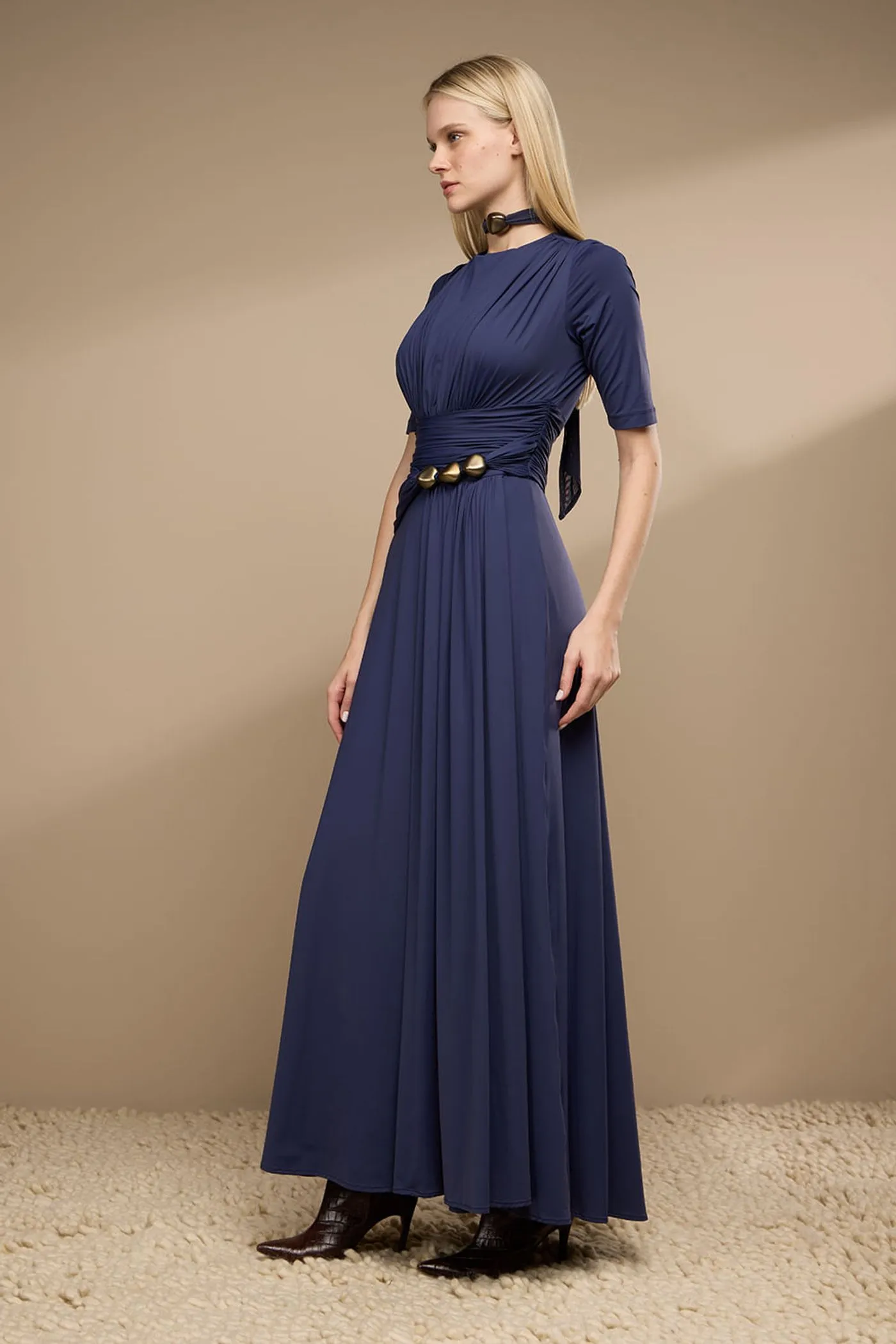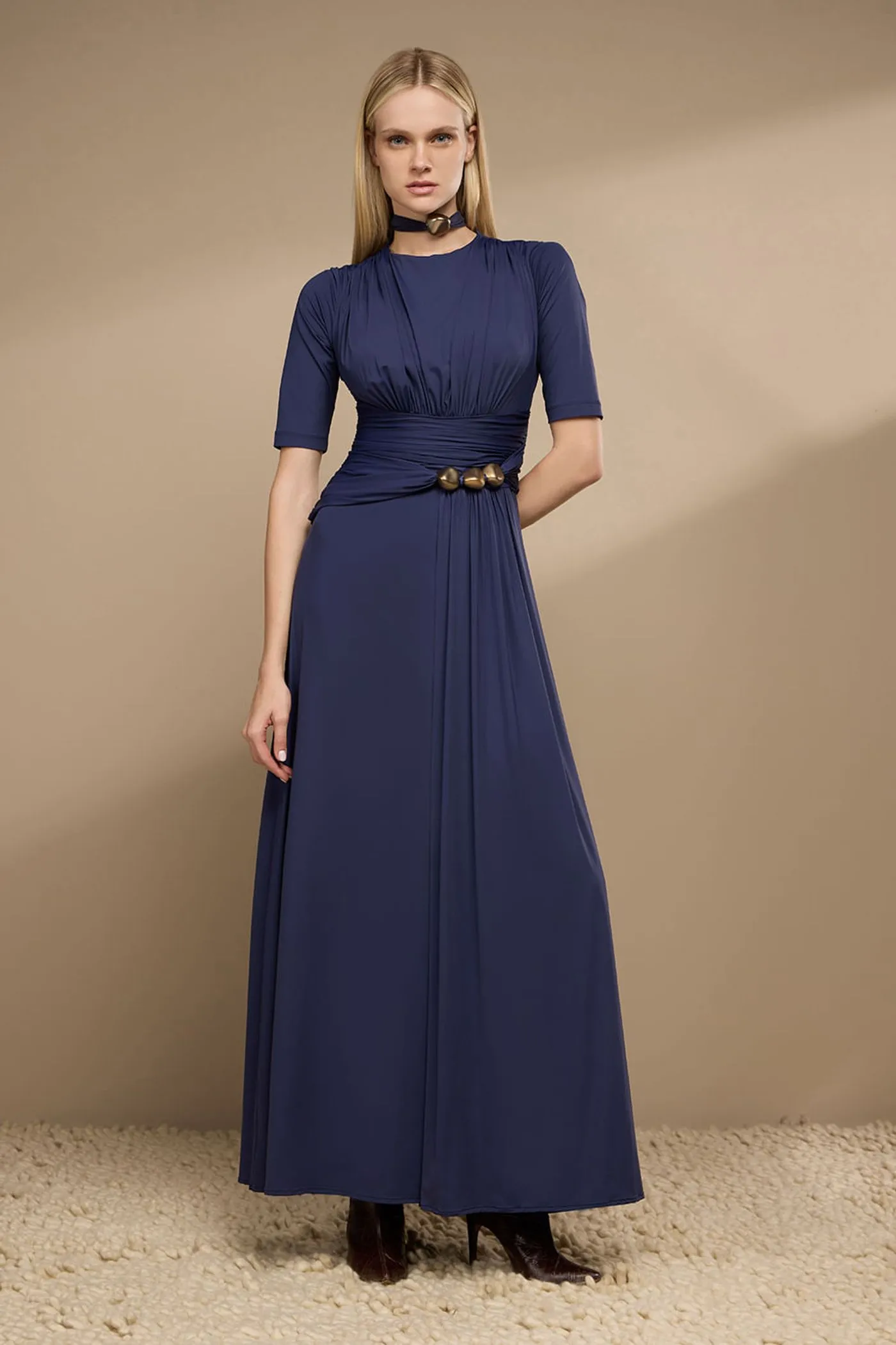 Vestido longo em malha fluity com cintura marcada e detalhes em resina, trazendo movimento