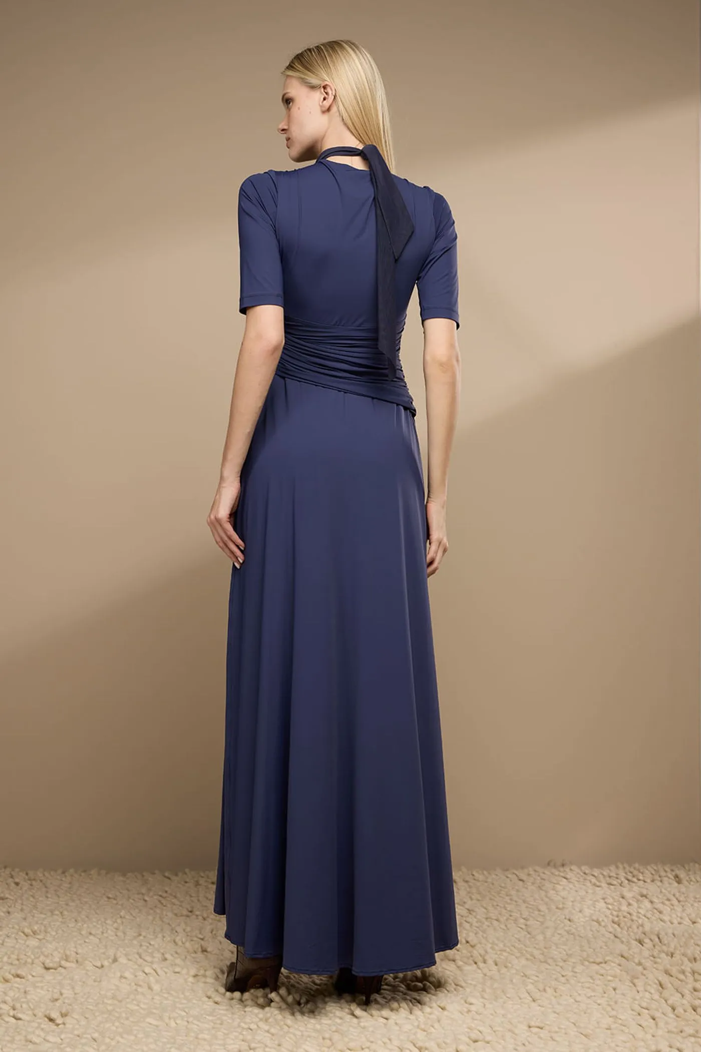 Vestido longo de caimento fluido, confeccionado em malha fluity, nos tons de azul, marrom e verde. O grande destaque está na cintura franzida, que define a silhueta de forma sofisticada e é enriquecida por adornos cobre em resina, trazendo um toque de luxo e personalidade ao design. A partir da cintura, surge uma faixa longa no mesmo tecido que acompanha o comprimento até a barra, criando fluidez, dinamismo e ainda mais elegância ao caminhar. Uma peça impactante e atemporal, perfeita para ocasiões especiais que pedem presença e refinamento.