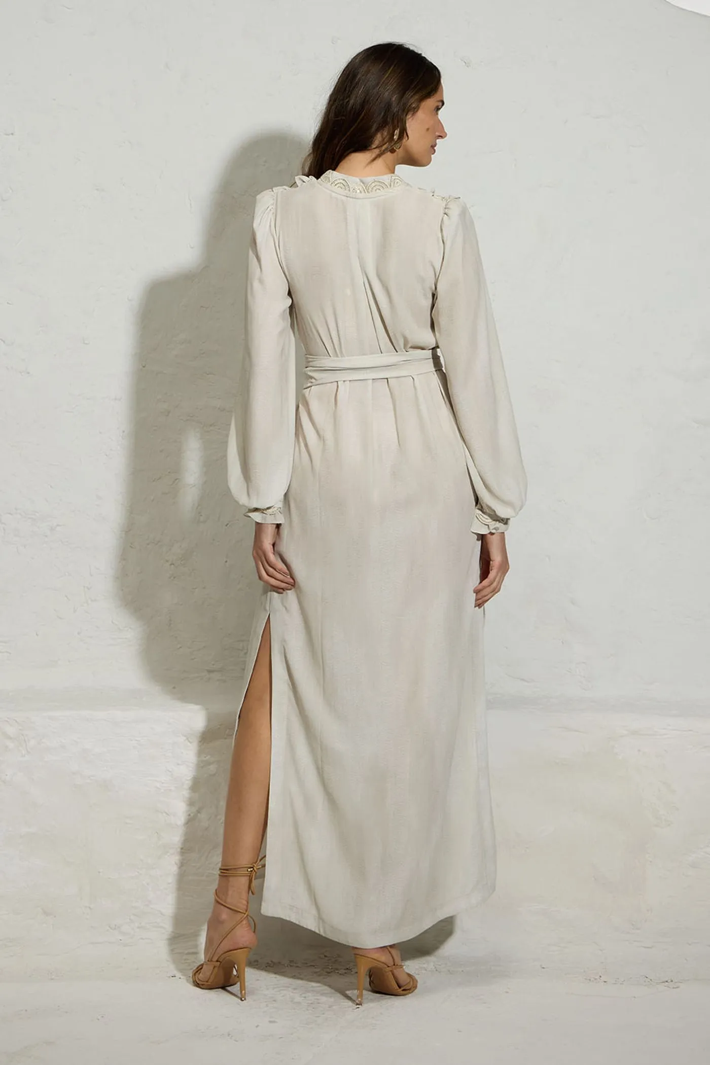 Com uma leitura leve e sofisticada, o vestido longo com estampa grega traz um visual elegante que se revela nos detalhes. A fluidez do tecido acompanha a silhueta com movimento, enquanto os babados e bordados delicados em paetê criam um efeito suave e luminoso. O tom off-white com padronagem exclusiva reforça o frescor dos dias mais quentes e se conecta naturalmente à estética refinada