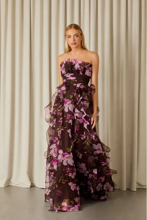 Vestido confeccionado em organza 100% seda na cor Pink Flower, que revela uma estética leve, sofisticada e marcante. O tecido nobre valoriza a estampa floral, intensificando suas cores e conferindo um acabamento delicado e refinado. A modelagem apresenta decote tomara que caia, que destaca o colo com elegância, enquanto a saia evasê ganha protagonismo com babados em cascata, criando volume romântico e movimento fluido ao caminhar. O resultado é uma peça feminina e imponente, perfeita para ocasiões especiais que pedem charme e presença.