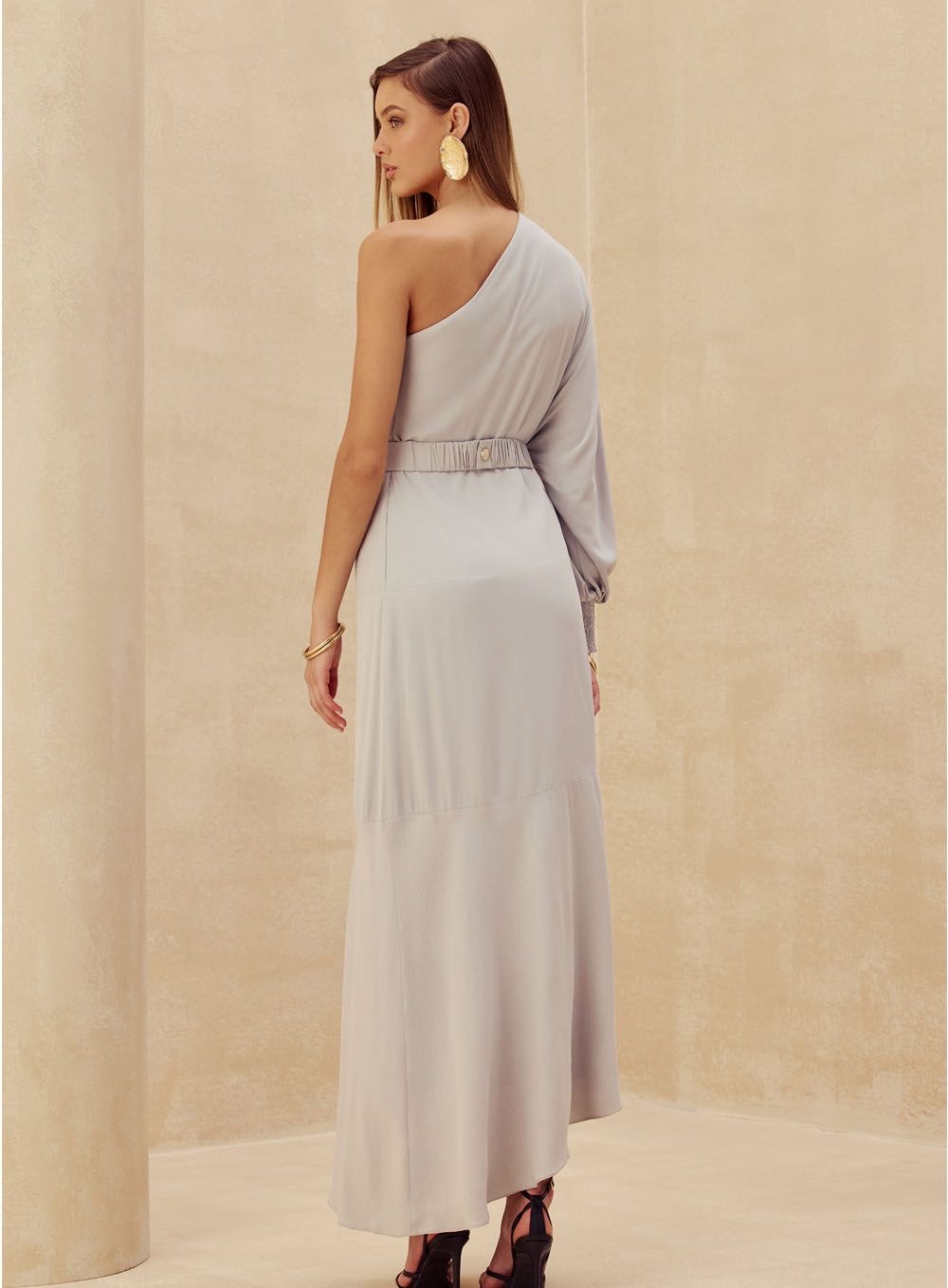 Vestido com um ombro só e o outro lado com uma manga bufante com ajuste no punho e um laço na altura da cintura