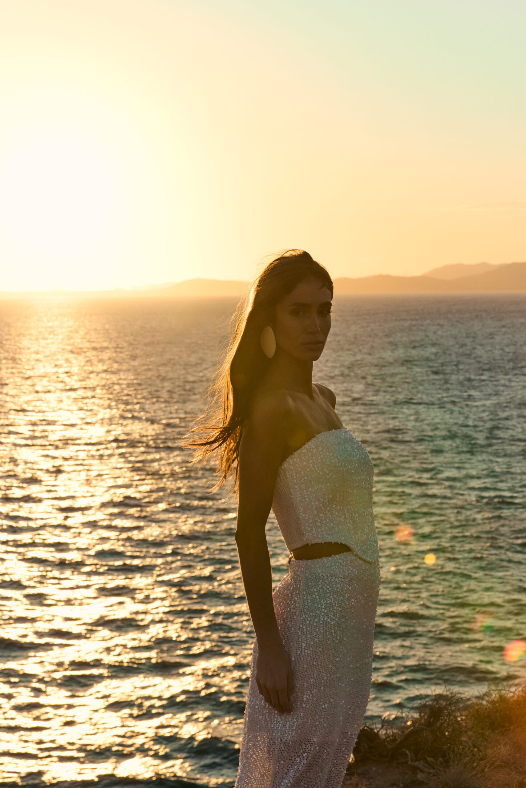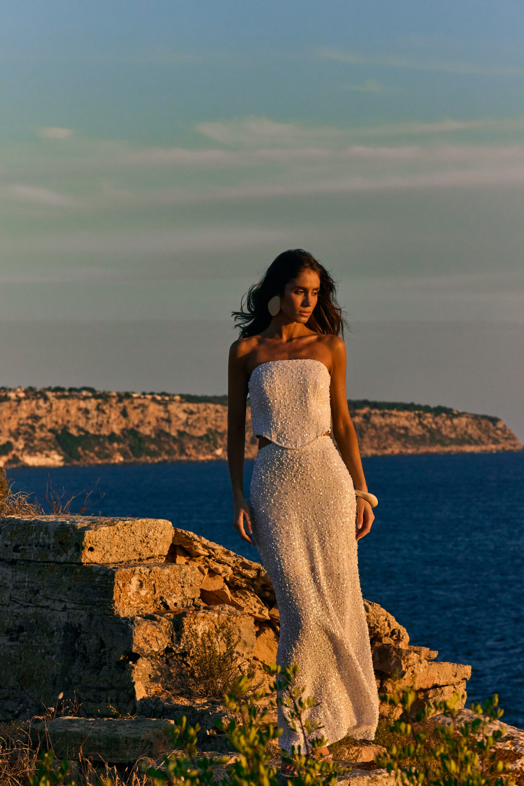 Um vestido deslumbrante em tecido de paetê, elaborado com um corset estruturado que valoriza a silhueta e apresenta um decote reto de sofisticação atemporal. A saia combina elegância e modernidade: possui forro até a altura dos joelhos, garantindo conforto e discrição, enquanto o comprimento restante permanece translúcido, revelando um brilho sutil e um caimento leve. Uma peça que une glamour e delicadeza em cada detalhe.