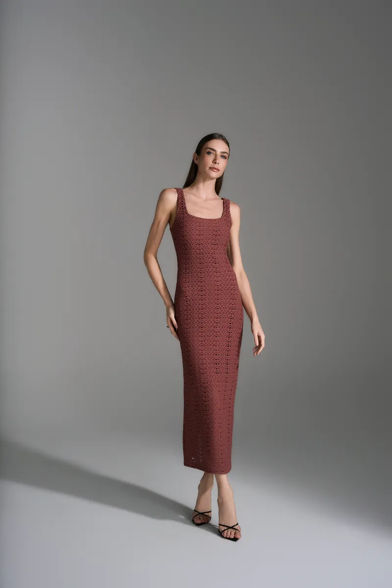 Vestido maxi midi em malha vazada com textura, decote quadrado frente e costas e alças largas. Modelagem ajustada ao corpo, forro mais curto e fenda traseira que traz movimento e elegância ao look.